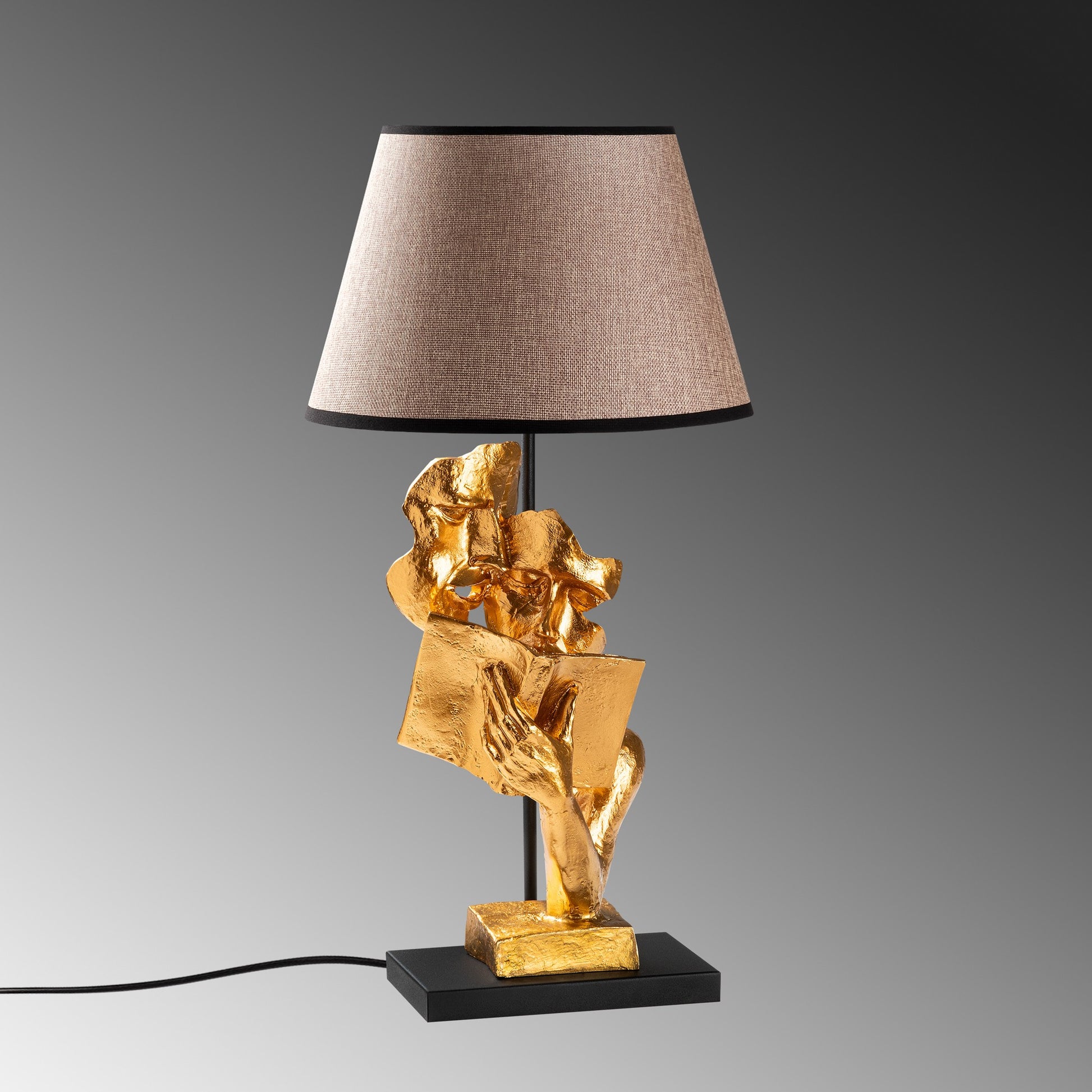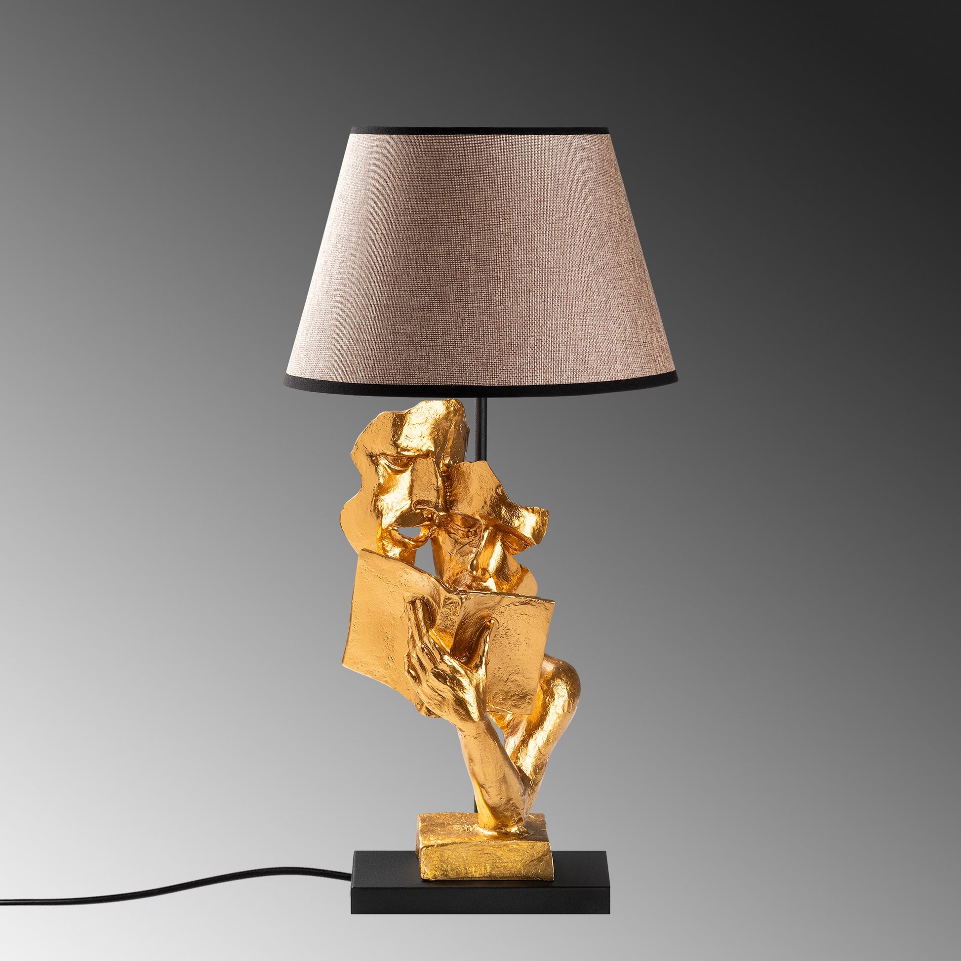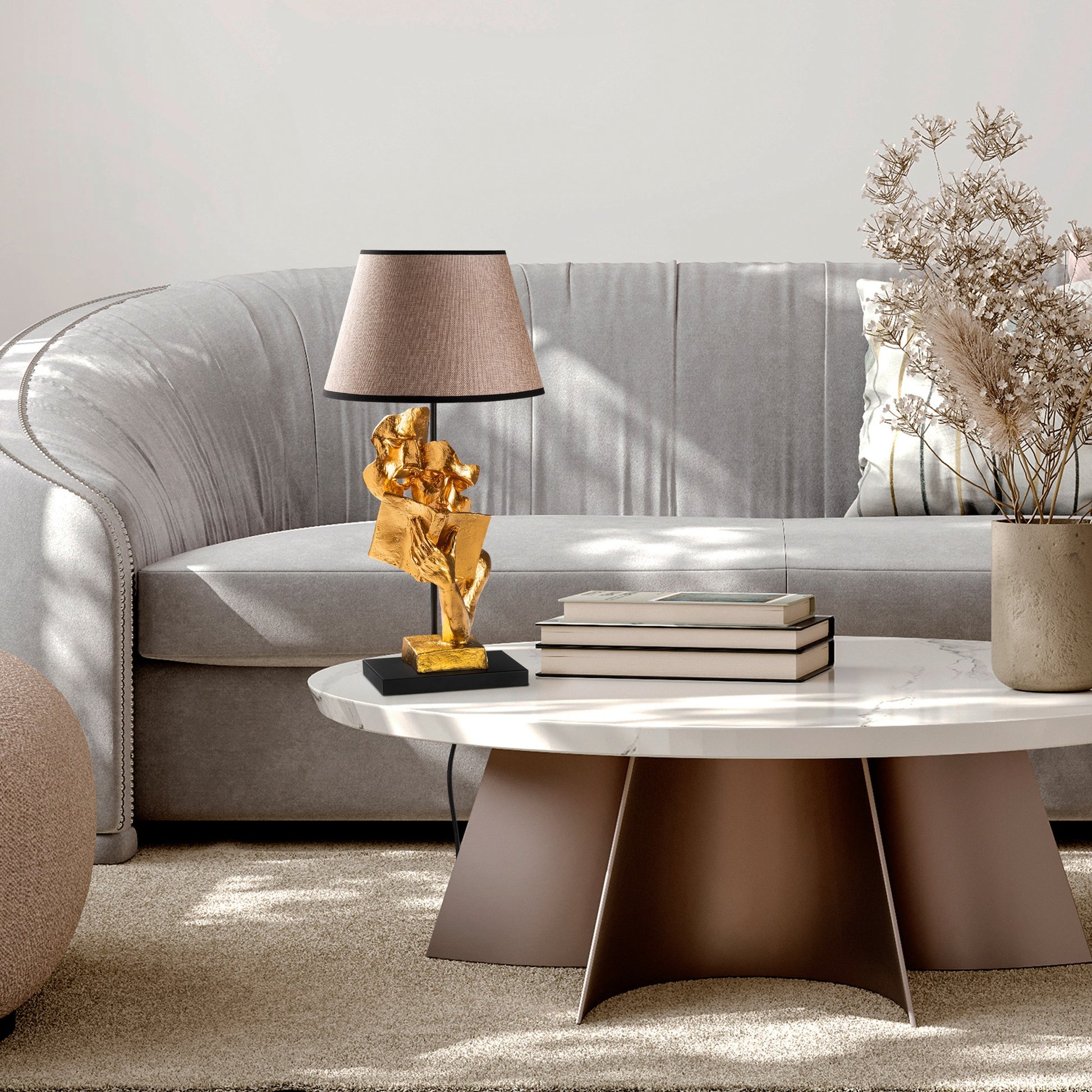 Ilumine seu espaço com o brilho quente e acolhedor de nossa deslumbrante Lâmpada de Mesa. Feita com um capô de tecido em uma bela mistura de Dourado e Marrom Claro, esta lâmpada exala elegância e sofisticação.