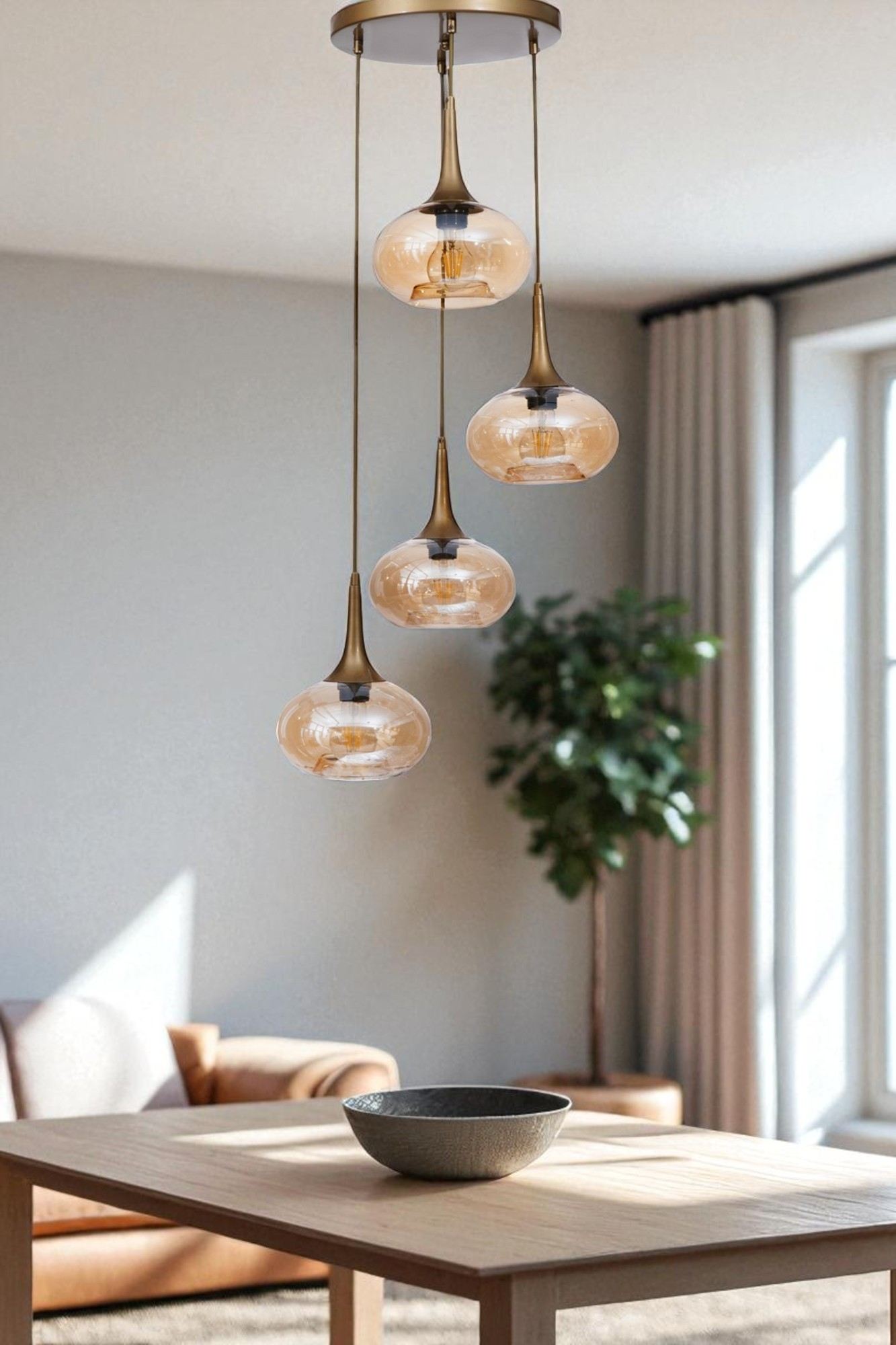 O lustre possui um corpo de metal elegante e uma cúpula de vidro, criando um visual luxuoso e moderno que aprimorará a estética de qualquer espaço. As cores mel e ouro adicionam um toque de calor e sofisticação ao design, tornando-o a peça de destaque perfeita para sua casa.