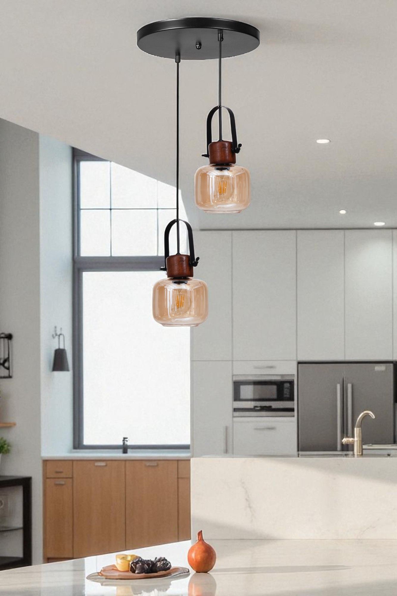 Candeeiro de Teto – Altura Ajustável 80 cm – Cor Mel, Nogueira e Preto – Metal e Vidro