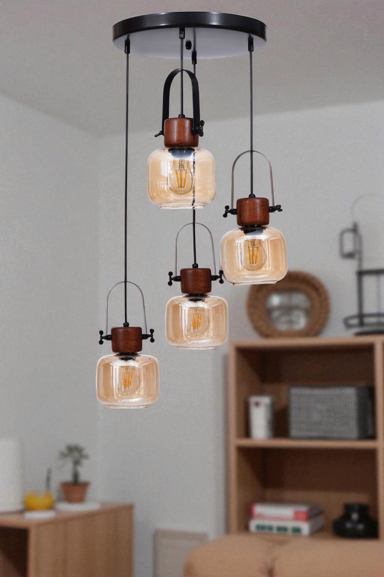 Candeeiro de Teto – Altura Ajustável 80 cm – Cor Mel, Nogueira, Preto – Metal e Vidro