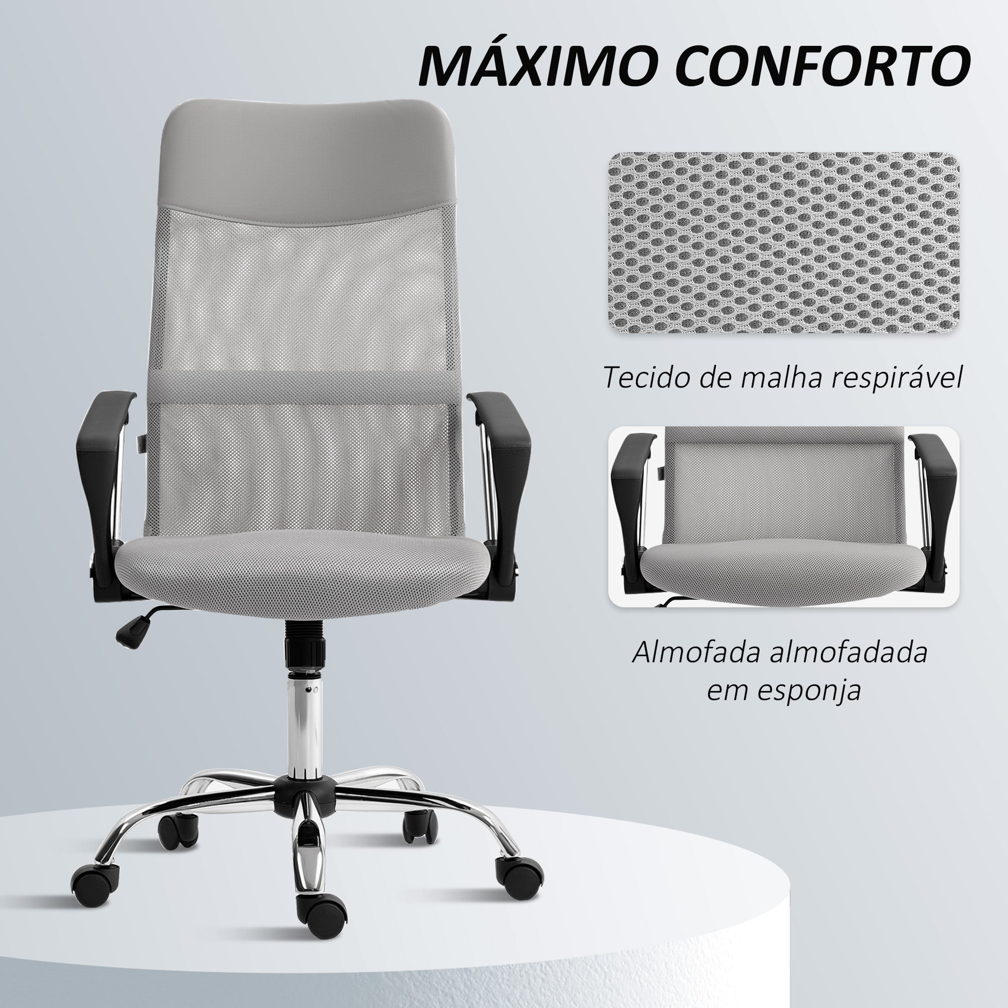 - Outras Especificações: Giratória em 360°, altura ajustável de 109 cm a 119 cm, capacidade máxima de carga de 120 kg.