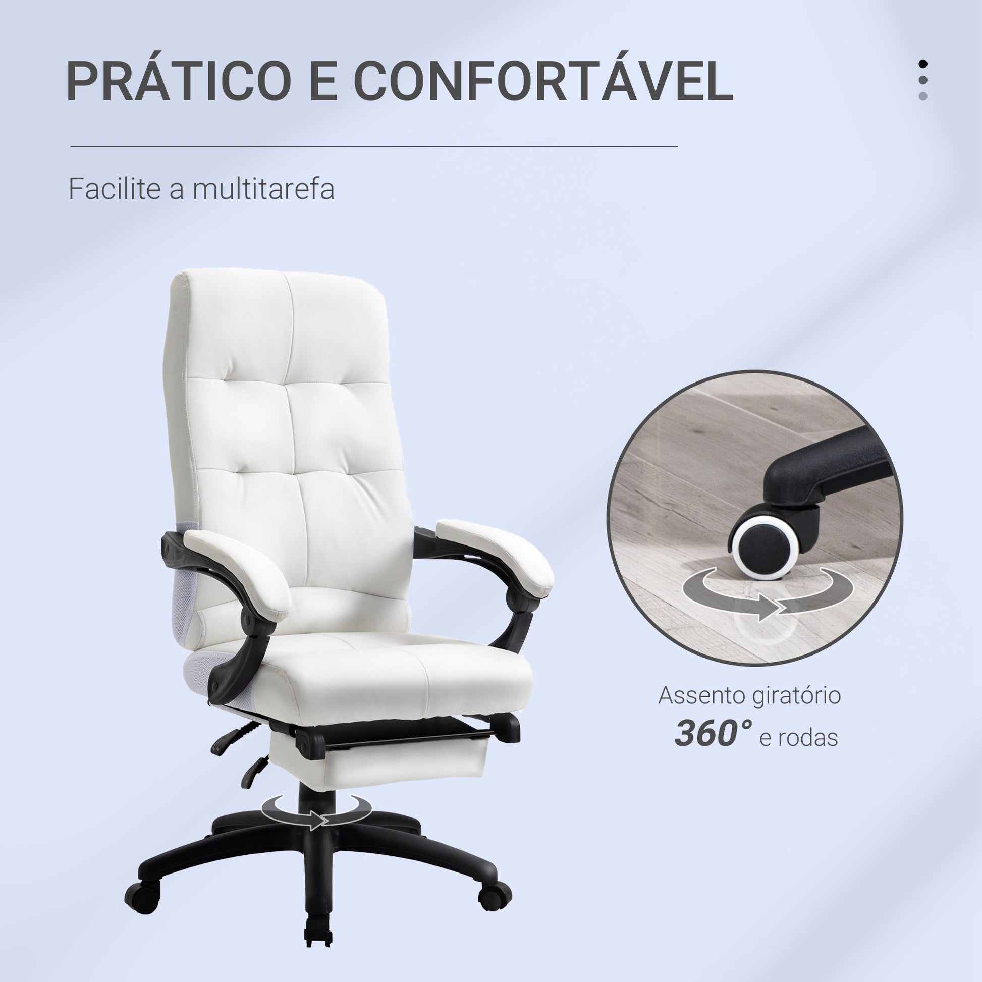 - Benefícios: Encosto reclinável até 165°-170°, apoio para os pés retrátil, altura ajustável por elevador a gás