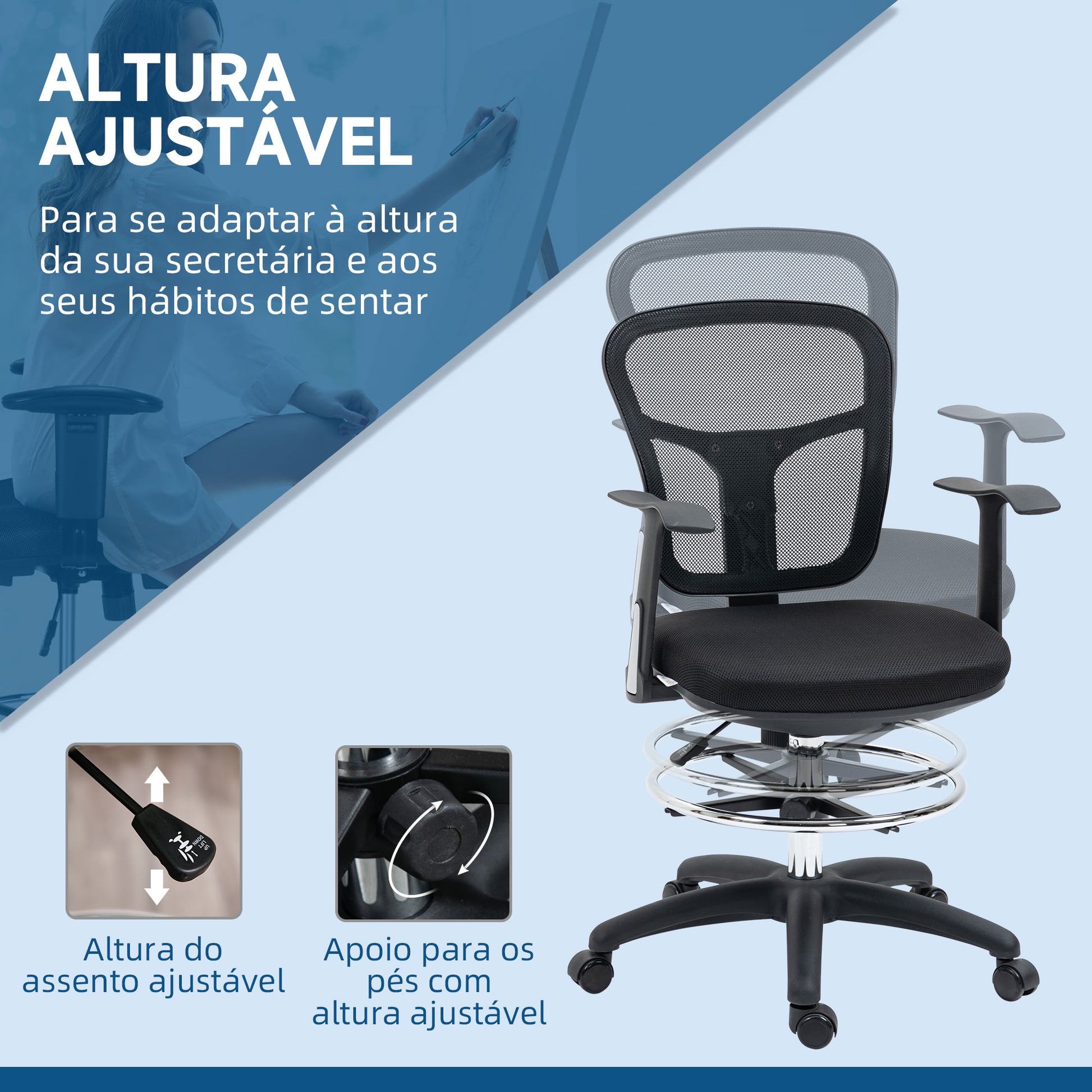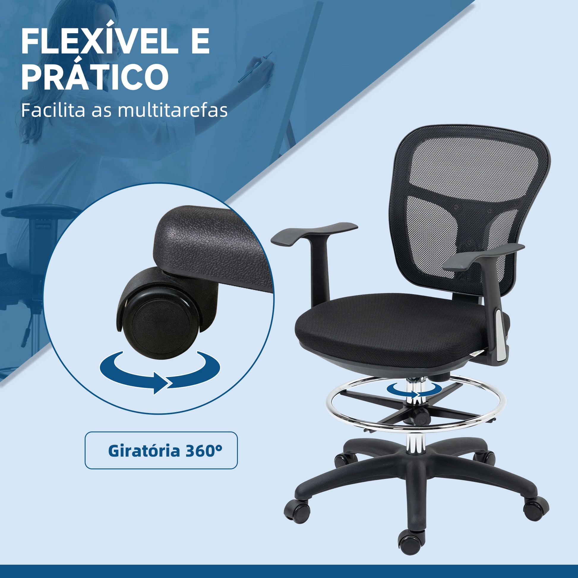 - Outras especificações: Rodas giratórias, assento ajustável, capacidade de carga de 120 kg