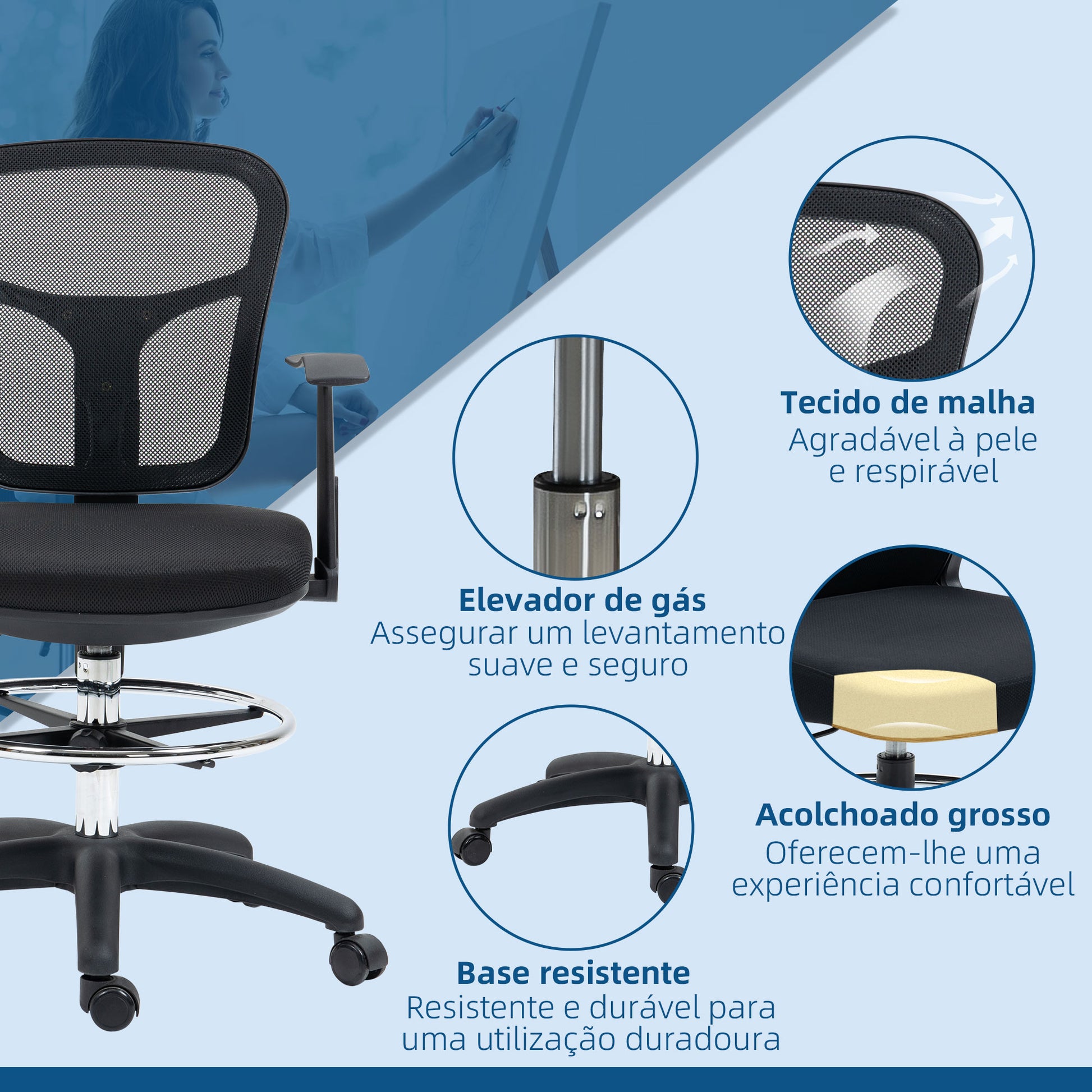 - Usos recomendados: Ideal para trabalho, estudo, desenho, proporcionando conforto e suporte adequado
