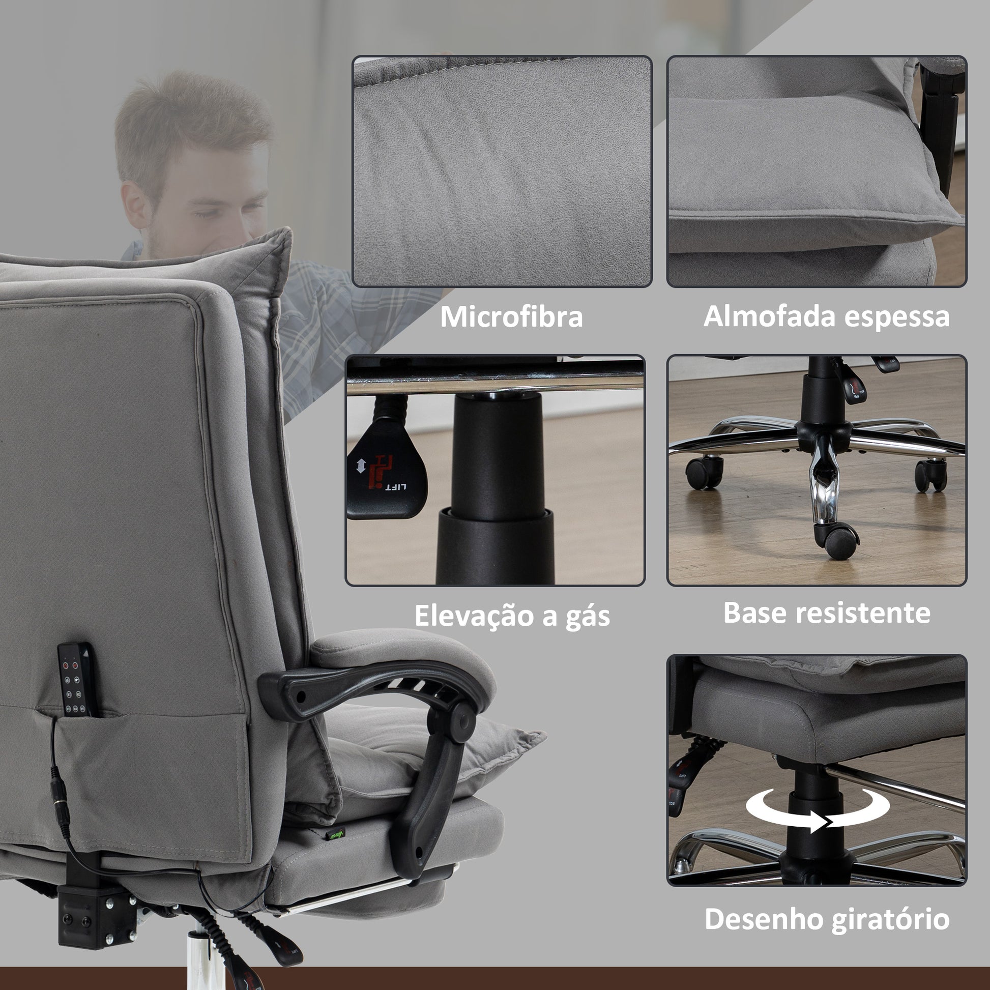 - Benefícios: Massagem vibratória de seis pontos com cinco modos, aquecimento lombar, reclinação até 155°, apoio para os pés, suporte para pescoço, costas e lombar inferior, altura ajustável