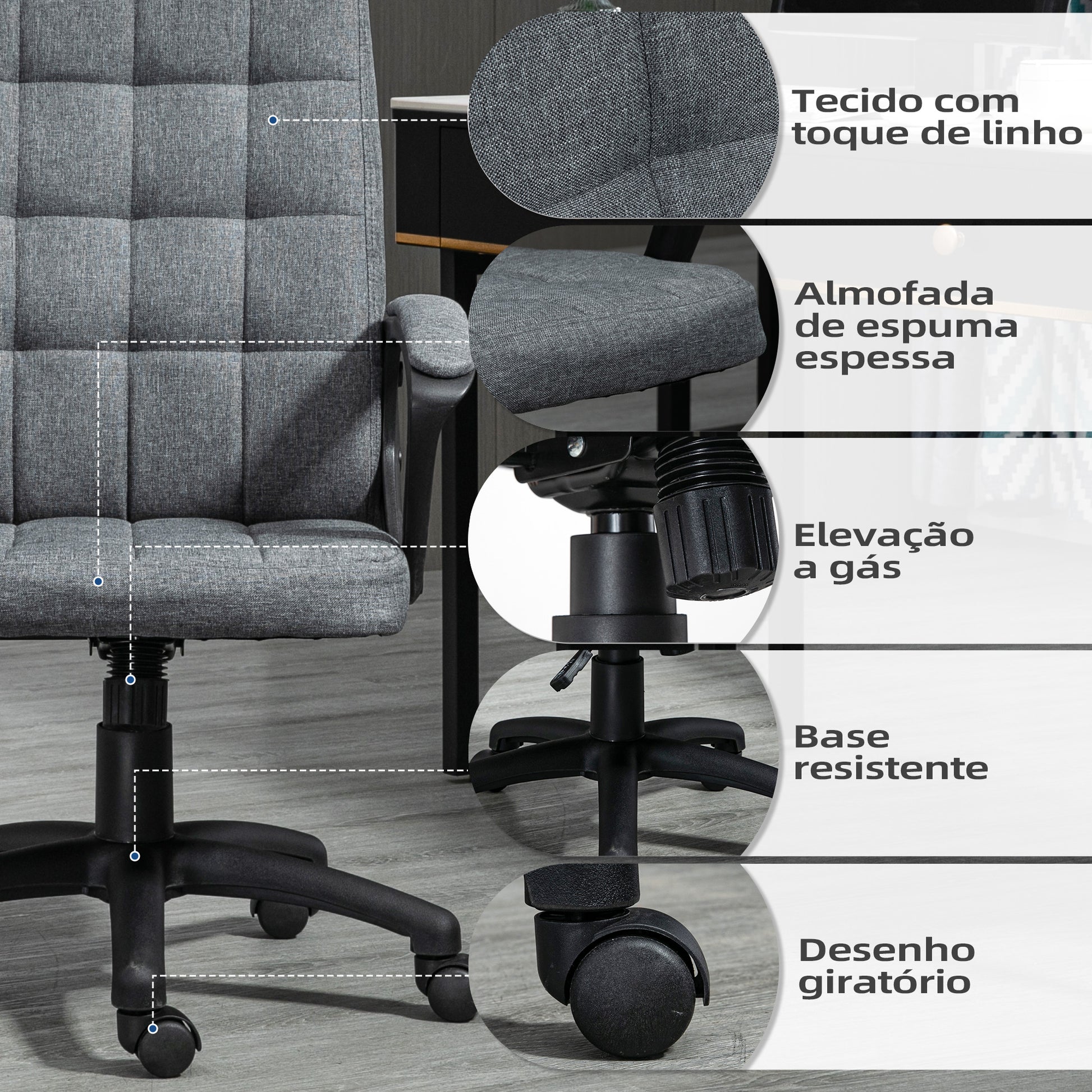Cadeira de Escritório Giratória – 59x63x96-105,5 cm – Cinza – Tecido de linho sintético