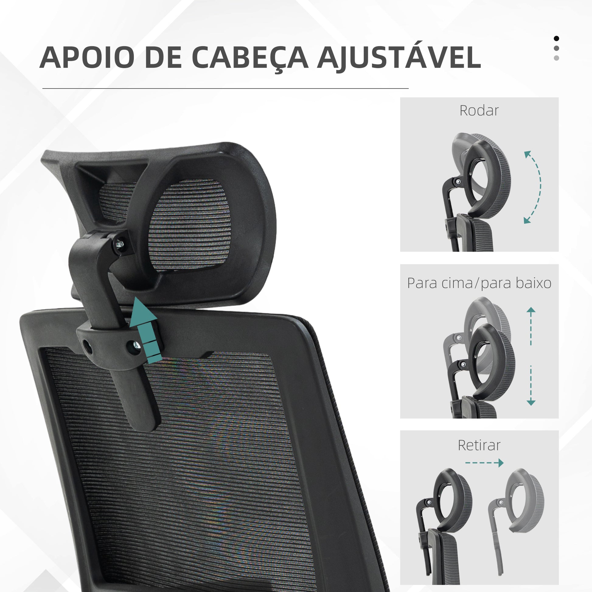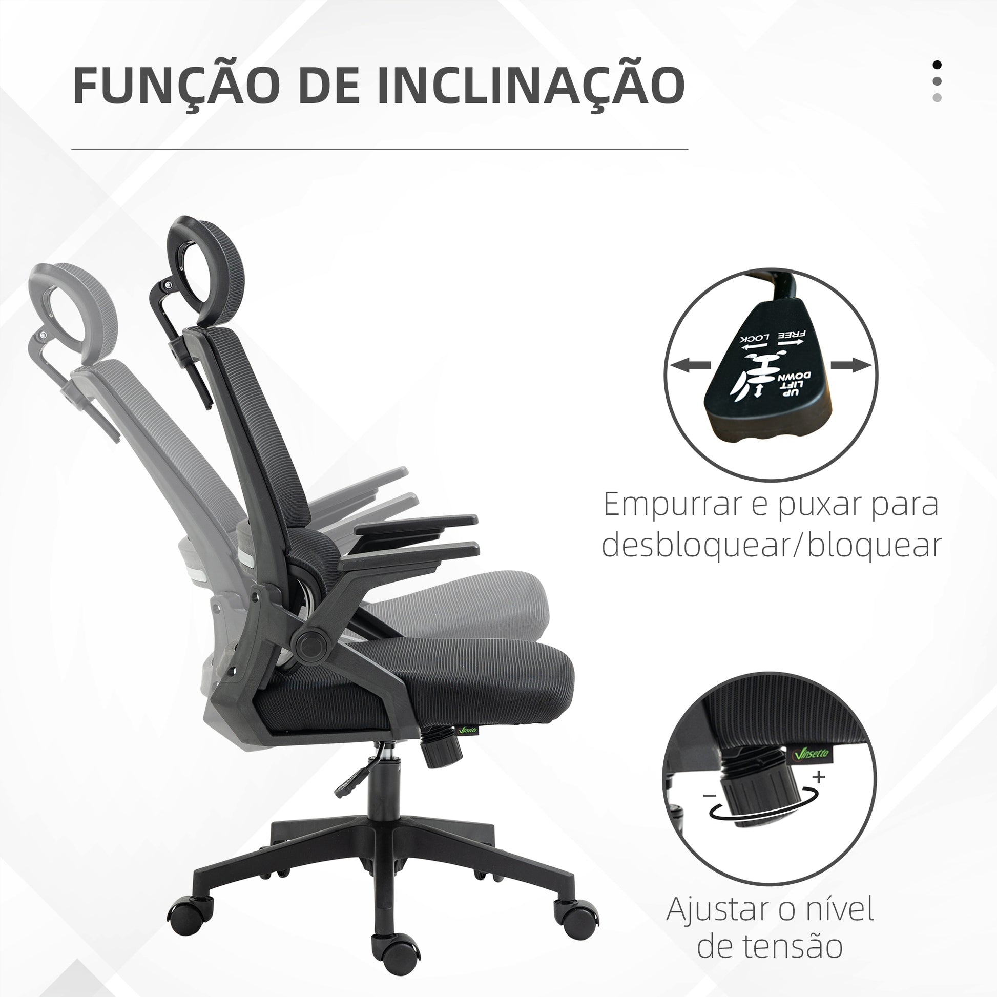 - Benefícios: Função de inclinação para alívio da pressão lombar, apoio de cabeça ajustável, apoio lombar e encosto alto para suporte completo