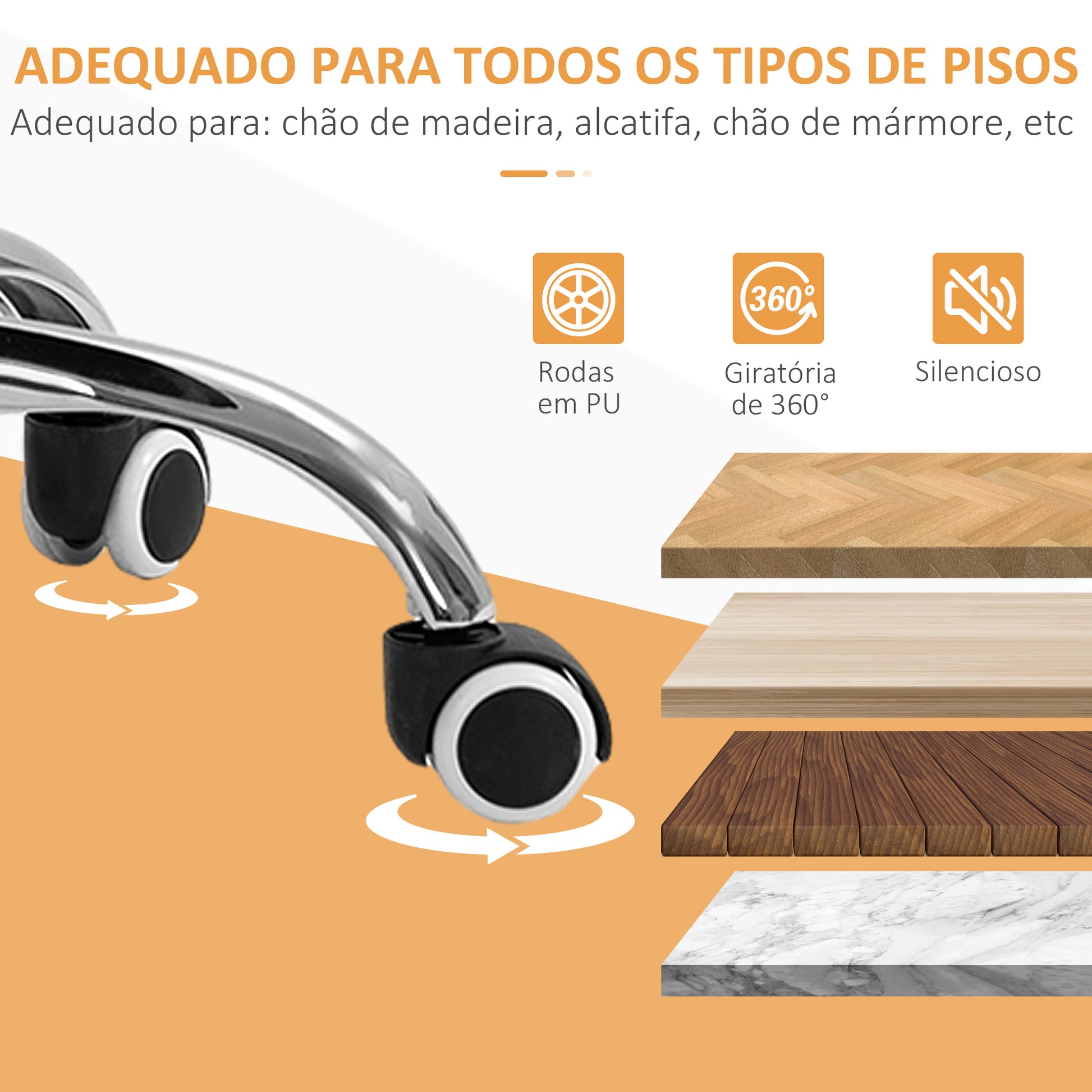 - Outras especificações: Rodas giratórias em PU seguras para vários tipos de pisos, suporta até 120 kg, requer montagem