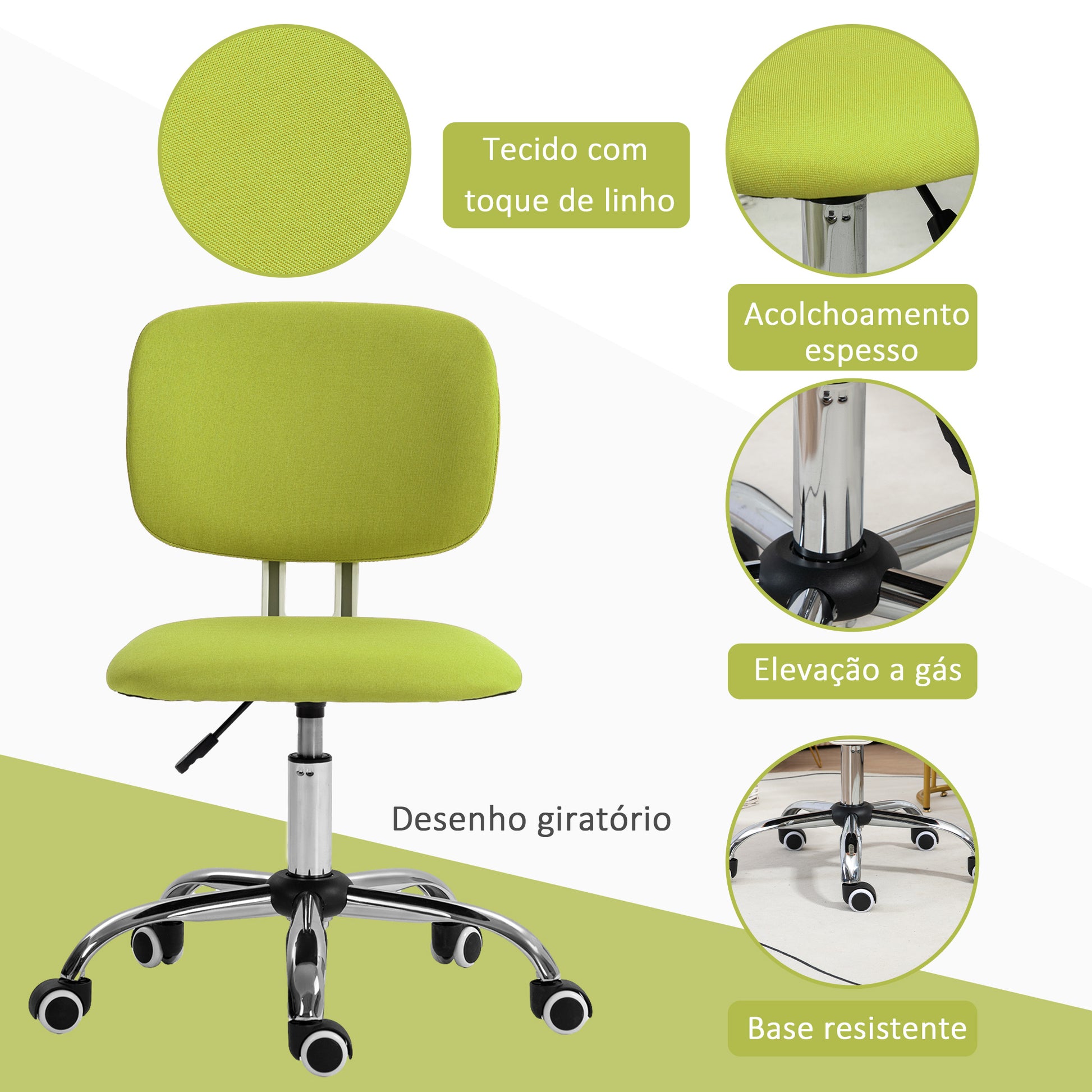 Desfrute de conforto e estilo em sua área de trabalho com esta cadeira de escritório estofada em verde. Perfeita para manter o frescor e o suporte necessário ao longo do dia.