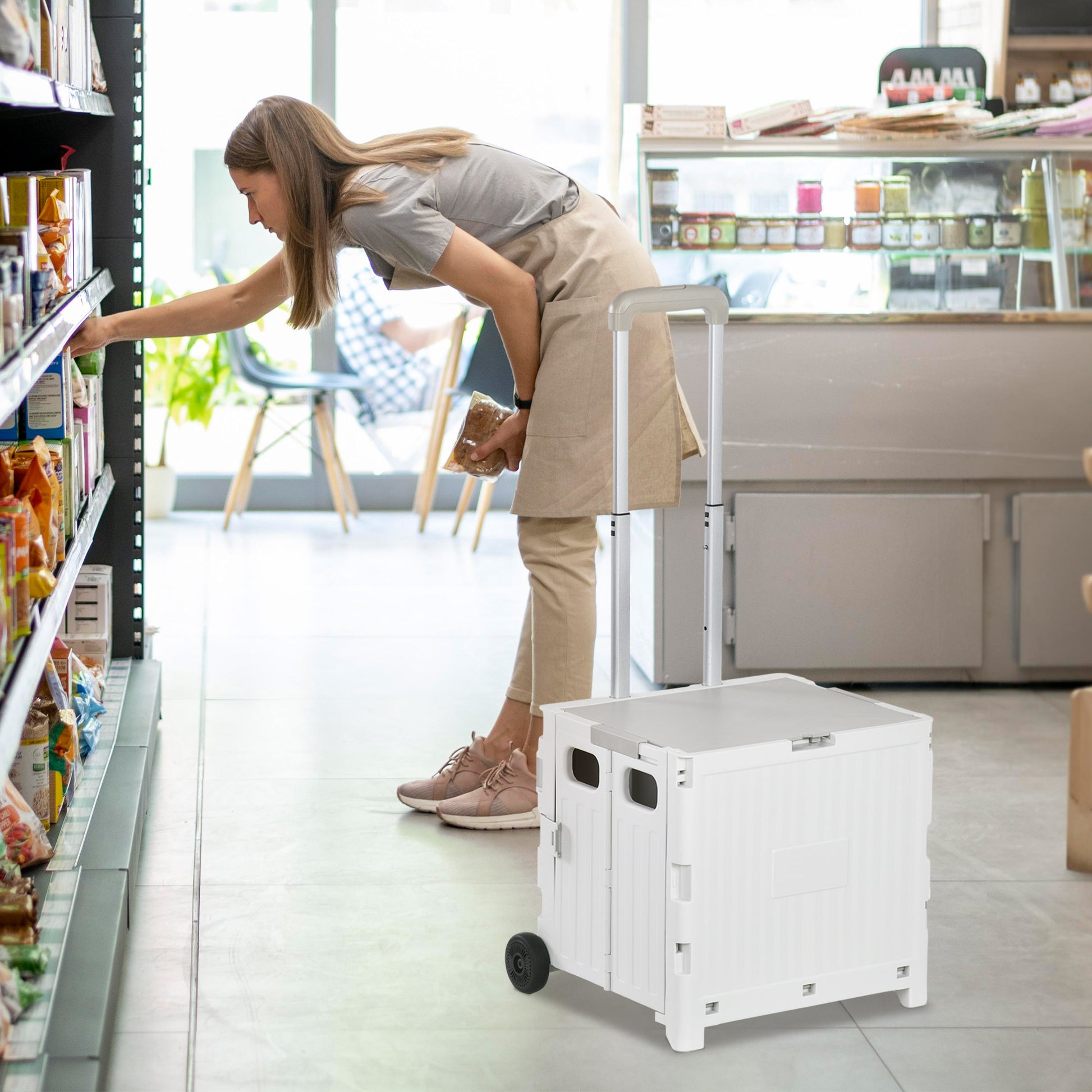 Com um design dobrável, este carrinho é fácil de armazenar quando não está em uso. A pega telescópica ajustável torna-o confortável para diferentes pessoas. Requer montagem.