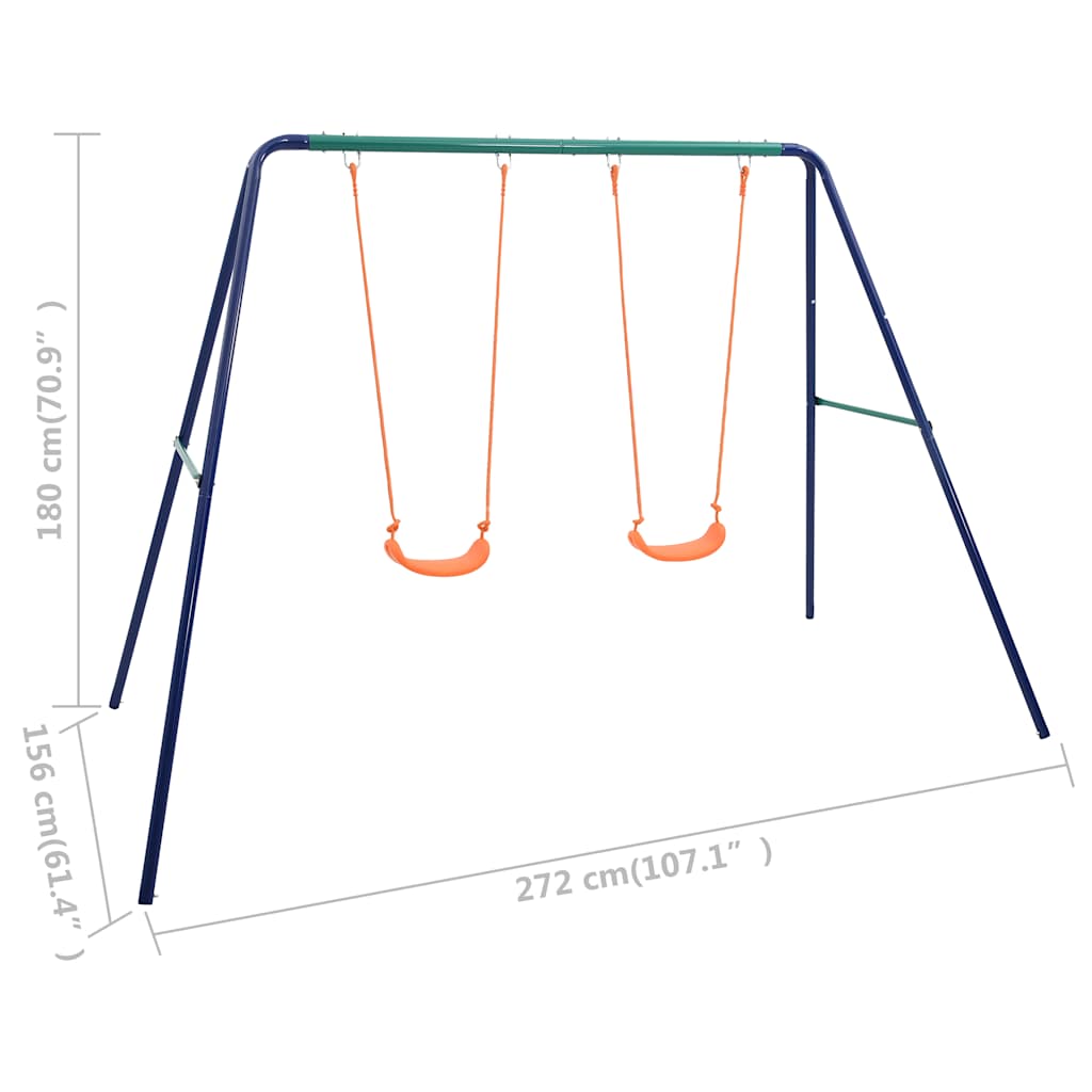 Este balanço é composto por uma estrutura em A de aço resistente com 2 assentos individuais. Graças à sua estrutura de aço resistente e assentos de plástico, o conjunto é extremamente durável e resistente às intempéries. Também é fácil de montar. Todos os balanços são fixados com segurança à robusta barra transversal em formato de A com suportes, parafusos, ganchos e cordas resistentes.