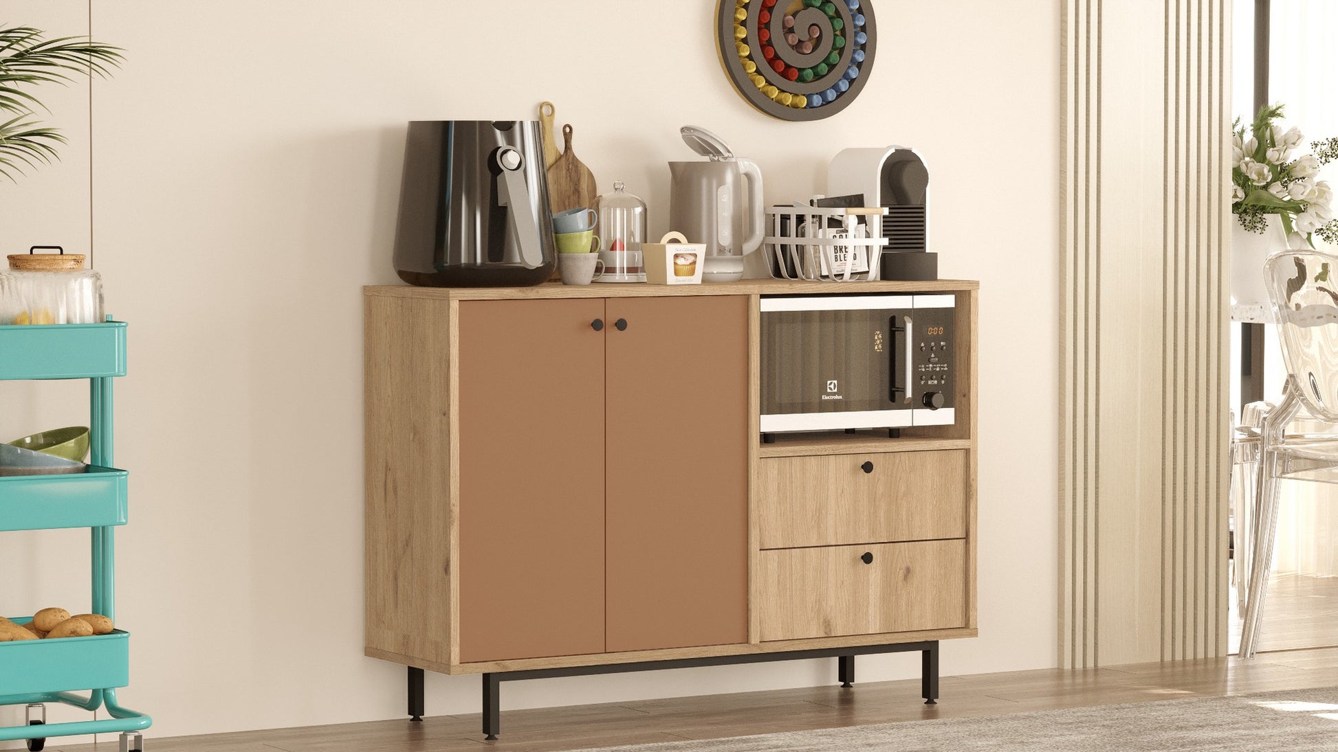 Armário multiuso – 120cm x 85cm x 35,5cm – Carvalho e Vermelho Azulejo – Aglomerado revestido a melamina