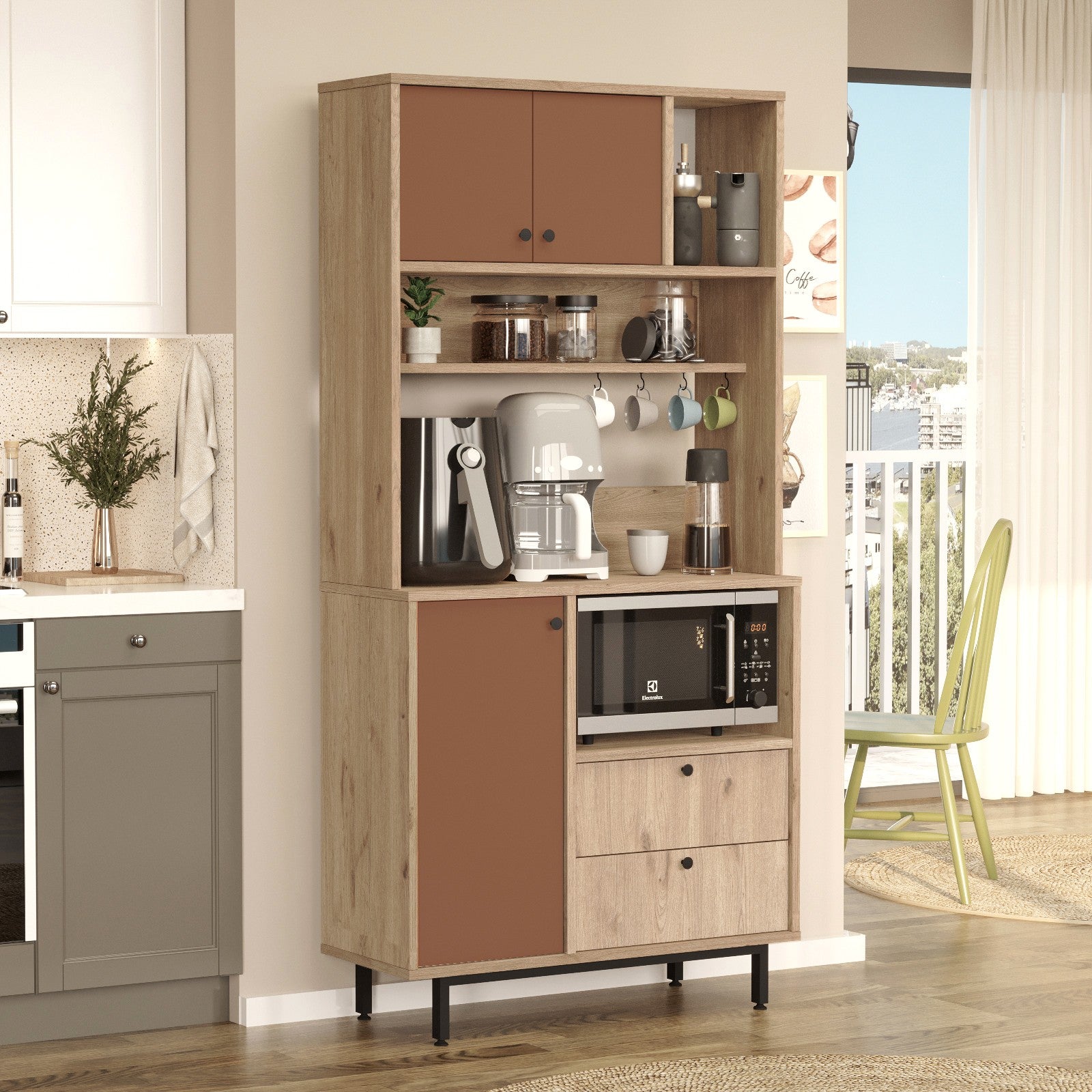 Fabricado em aglomerado de partículas 100% laminado, este armário não é apenas durável, mas também elegante. As cores carvalho e telha complementam qualquer decoração, acrescentando um toque de cor ao seu espaço.