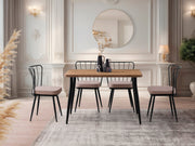Transforme a sua sala de jantar num espaço elegante e convidativo com a nossa deslumbrante mesa de jantar em pinho atlântico. Fabricada a partir de painéis de partículas 100% revestidos a melamina, esta mesa não só é durável, como também é fácil de limpar, o que a torna perfeita para o uso quotidiano. As elegantes pernas de ferro dão um toque moderno ao design, criando um belo contraste com o acabamento em madeira quente.