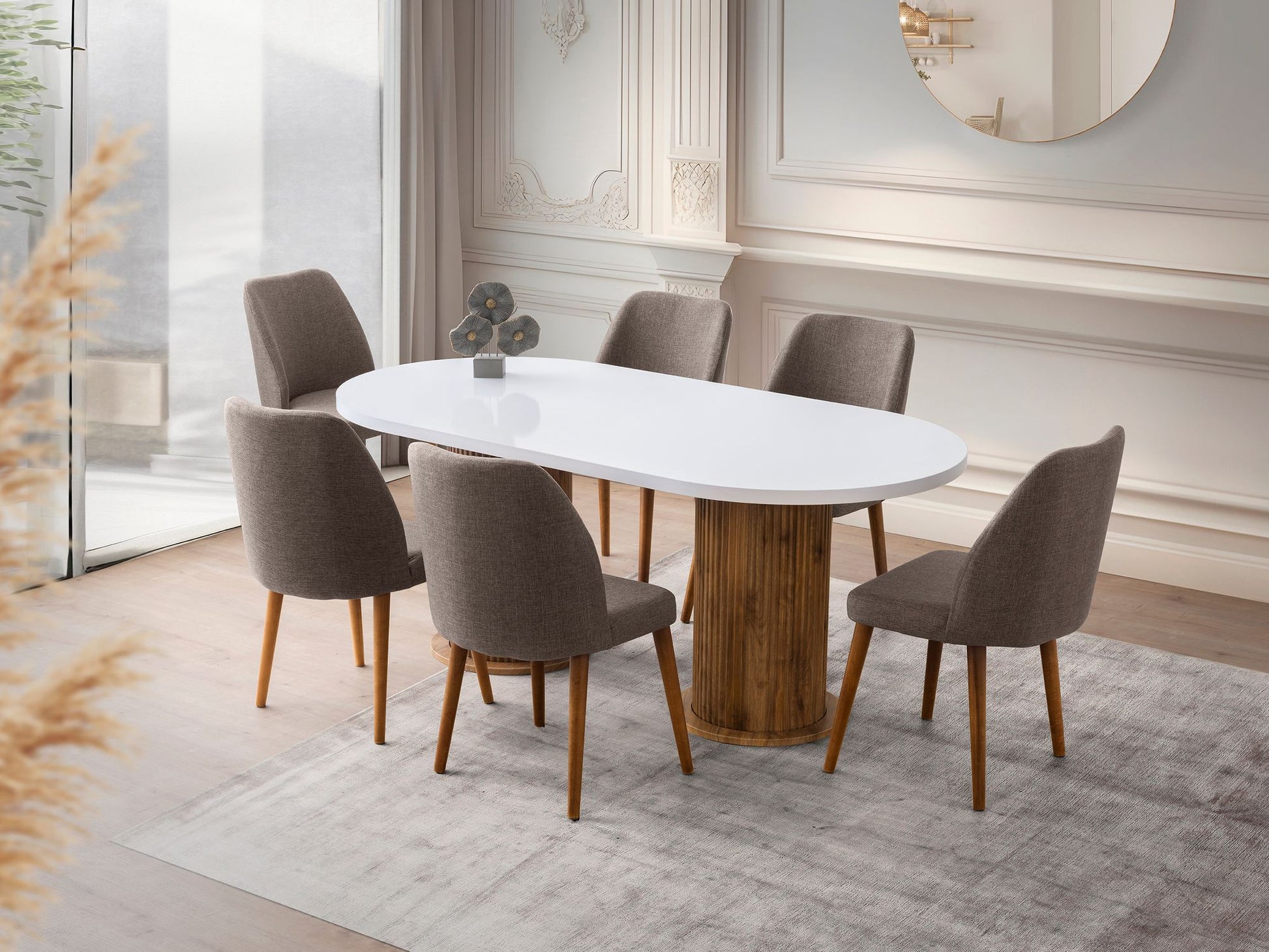 Imagine-se reunindo-se ao redor desta linda mesa de jantar com seus entes queridos, criando memórias que durarão uma vida inteira. O design elegante e a estética moderna instantaneamente elevarão a aparência da sua sala de jantar, fazendo com que cada refeição pareça uma ocasião especial.