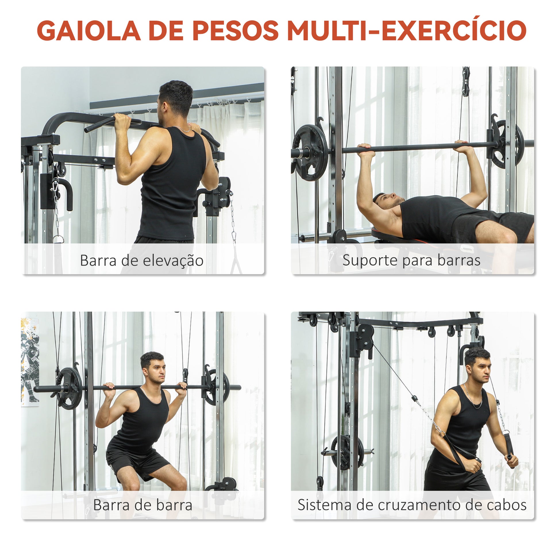 - Benefícios: Versatilidade para treino de corpo inteiro em casa; suporte ajustável para agachamentos; polias duplas para foco em grupos musculares específicos; flexibilidade de carga com sistema de cabos cruzados