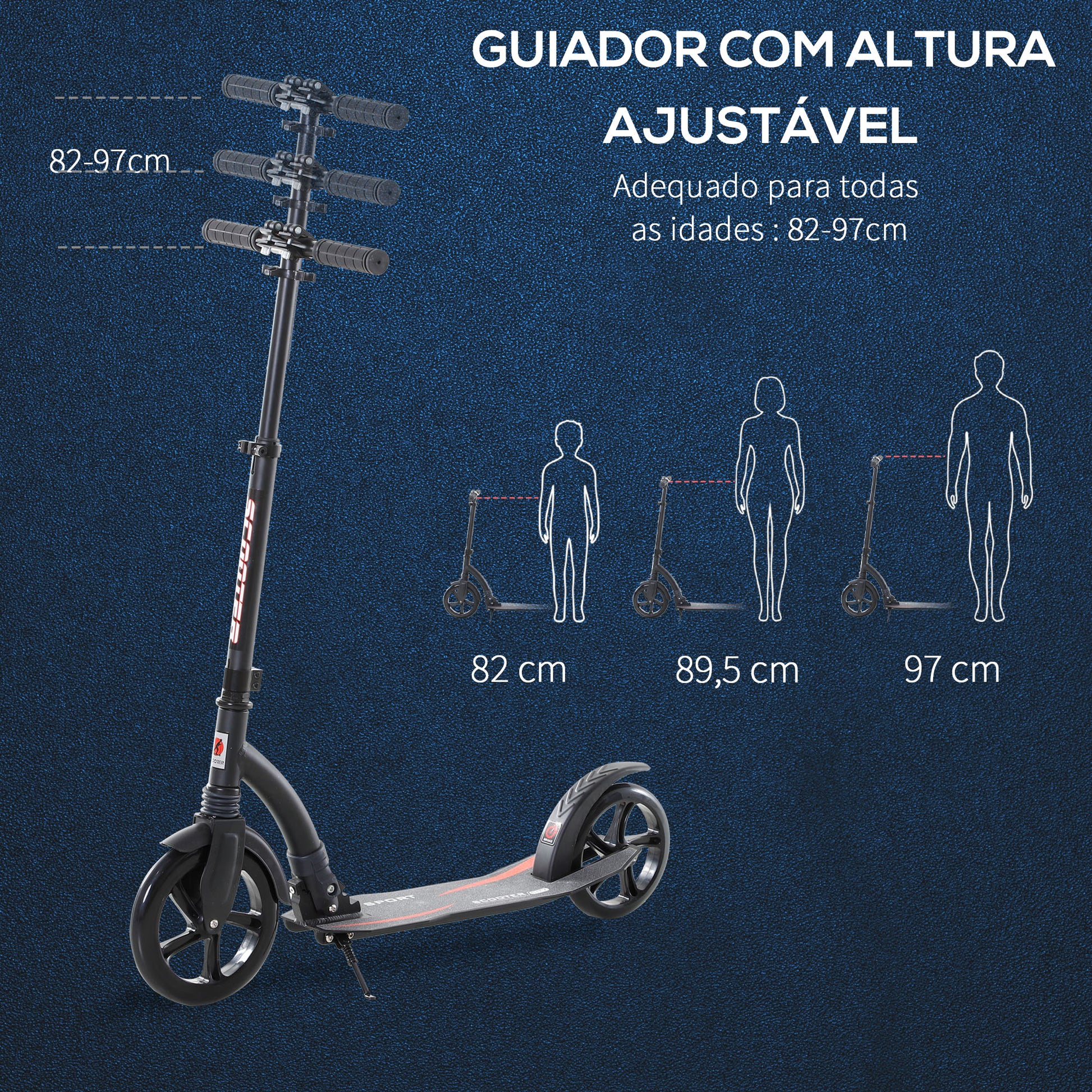Descubra a trotinete dobrável de alumínio perfeita para crianças acima de 14 anos, com altura ajustável de 87-101,5 cm e cor preta.