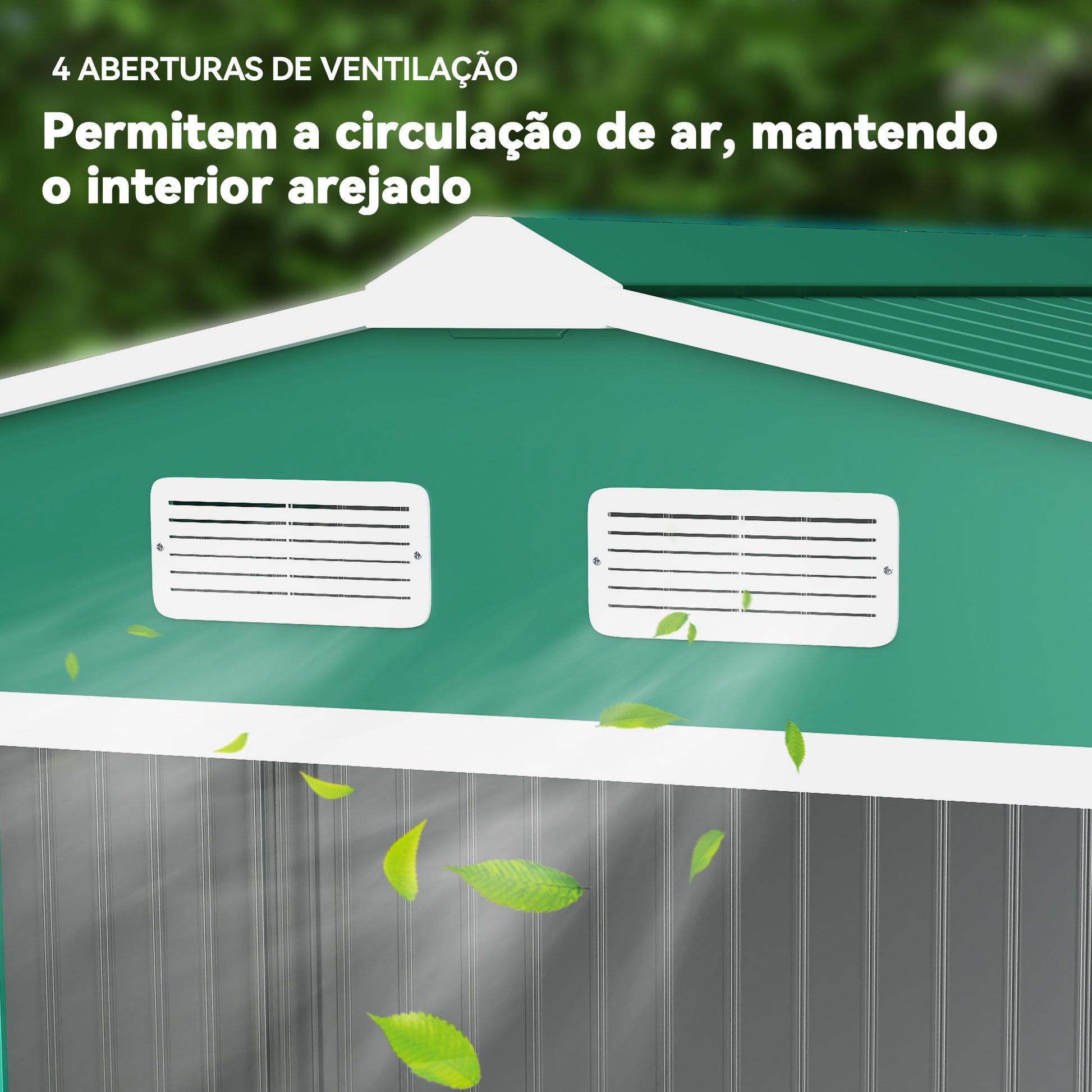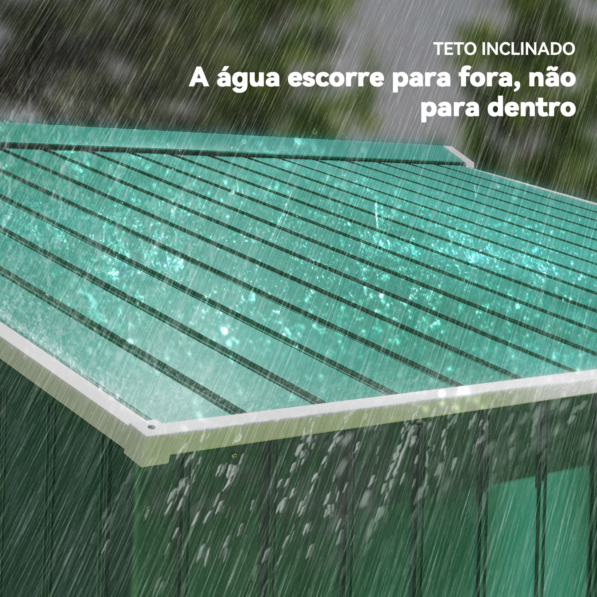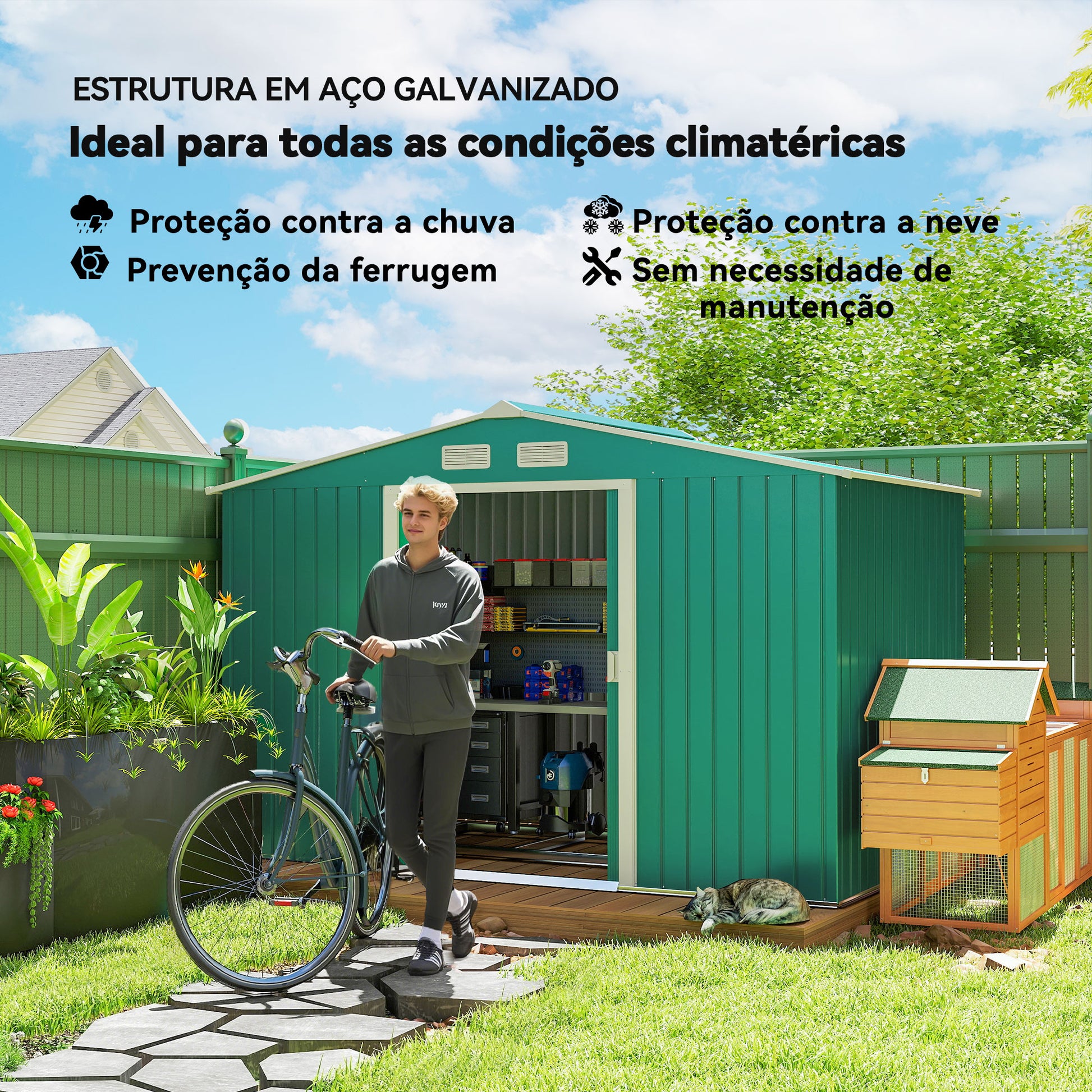 Este abrigo de jardim exterior verde escuro é ideal para armazenar ferramentas de jardinagem, acessórios para piscina e muito mais. Com medidas totais de 277x195x192cm (CxLxA), oferece um amplo espaço de armazenamento de 4,83m².