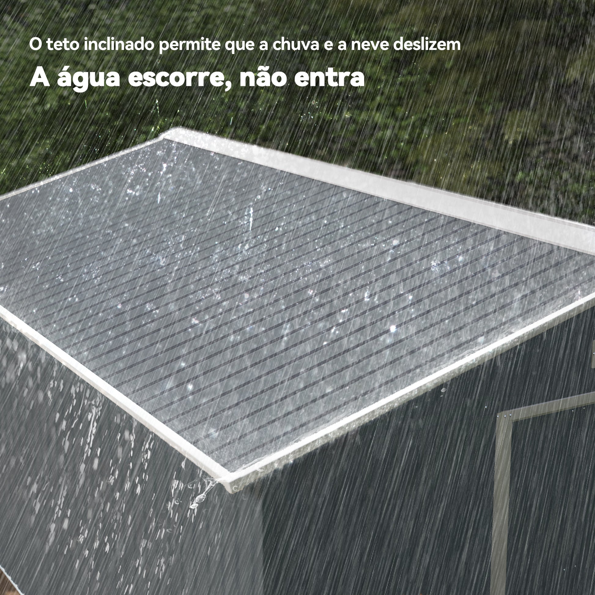 - Benefícios: Resistente e estável, com base reforçada. Teto inclinado para escoamento da água e porta dupla de correr para fácil acesso.