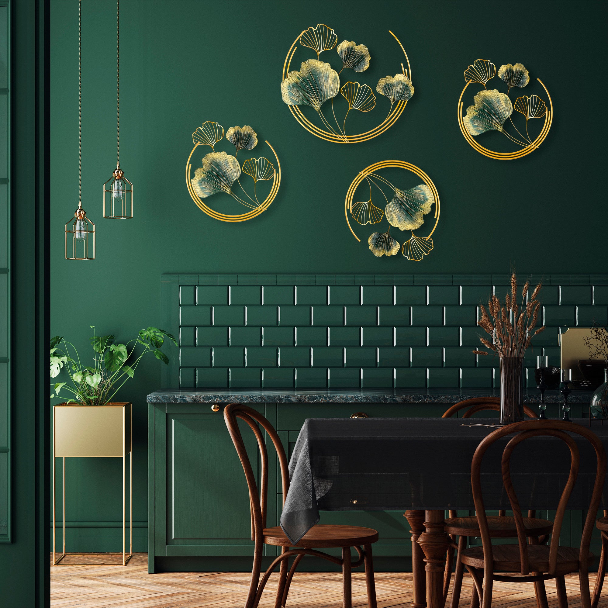 Com o seu design intrincado e um trabalho artesanal impecável, este acessório de parede irá certamente dar um toque de elegância e sofisticação a qualquer divisão. A combinação das cores verde vibrante e dourado luxuoso cria um atrativo visual hipnotizante que deixará os seus convidados admirados.