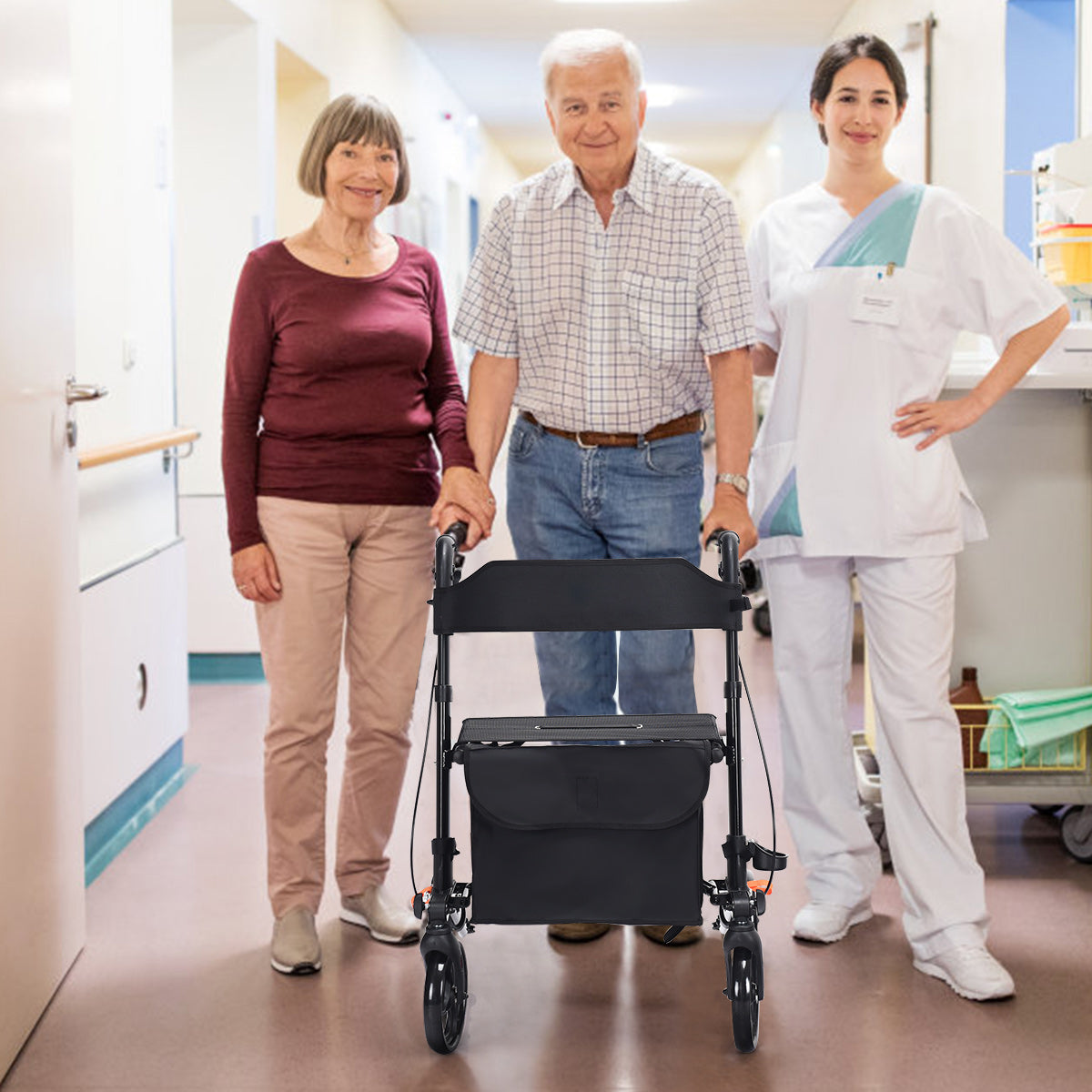 - Design ultracompacto: O design exclusivo do suporte transversal permite a dobragem lateral, permitindo-lhe ajustar a largura do andarilho para adicionar estabilidade. Isto permite-lhe passar por espaços estreitos com facilidade. As rodas dianteiras e as pernas traseiras dobram-se facilmente, permitindo-lhe guardar o andarilho na mala de viagem, no porta-bagagens do carro ou no armário.