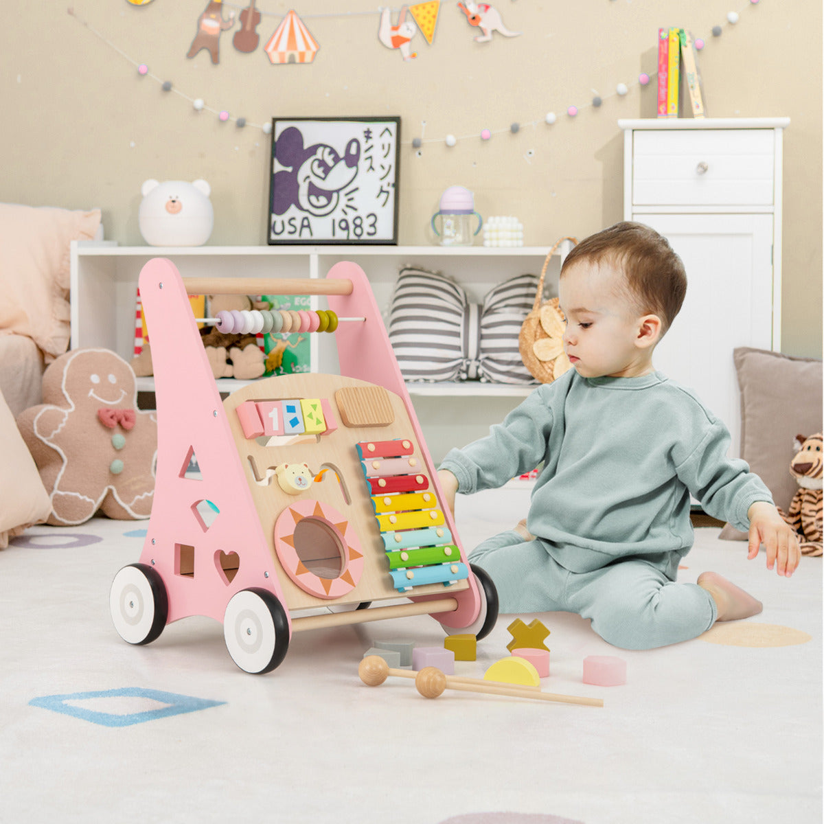 Andarilho de Madeira para Bebé Brinquedo de Atividade Educativo em Madeira com Rodas de Borracha Aprendizagem de Pé a Andar para Bebés Rosa