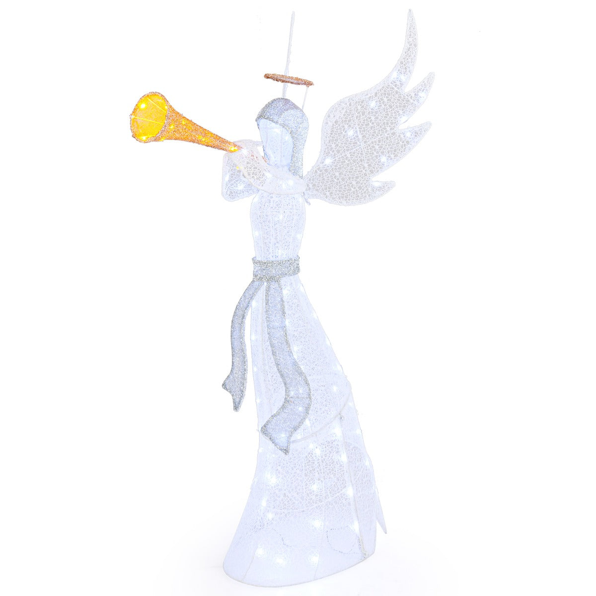 Características: Aparência elegante com halo, trombeta e grandes asas Adornado com um encantador cinto flutuante Iluminado por 100 brilhantes luzes LED para maior elegância Feito de materiais resistentes para um uso prolongado impermeável, resistente à neve, ao vento e ao sol Inclui 4 estacas para o solo e 20 bridas para alta estabilidade Ideal para casa, pátio traseiro, alpendre da frente, etc.