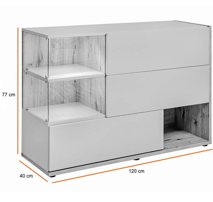 Aparador para a sala em linhas retas, branco e cinzento Sidney, com parte em vidro e luzes LED para destacar objetos especiais.