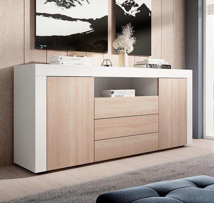 Armonioso e elegante aparador com cajones e puertas que criam um jogo de alternâncias entre espaços retangulares, ideal para um salão moderno.