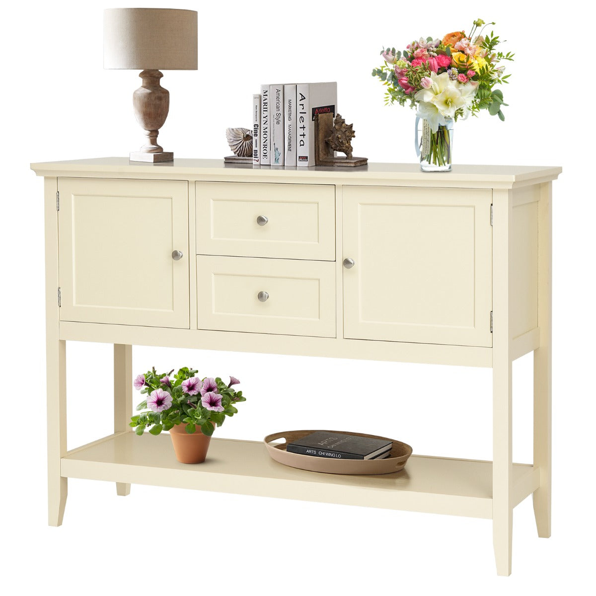 Características: MDF de alta qualidade e sólida madeira de pinho para garantir estabilidade e durabilidade; 2 armários e 2 gavetas espaçosos; Superfície e prateleira aberta para colocar itens essenciais ou expor objetos pessoais; Puxador de metal e guia para abrir e fechar as gavetas facilmente; Pode ser usado como consola, mesa de sofá, aparador, buffet ou mesa de entrada; Ideal para sala de estar, cozinha, entrada, escritório, etc.; Um toque luxuoso e elegante em qualquer casa; Mantém o ambiente limpo e organizado; Suporta até 100 kg; Superfície lisa fácil de limpar; Fácil de montar seguindo as instruções detalhadas.
