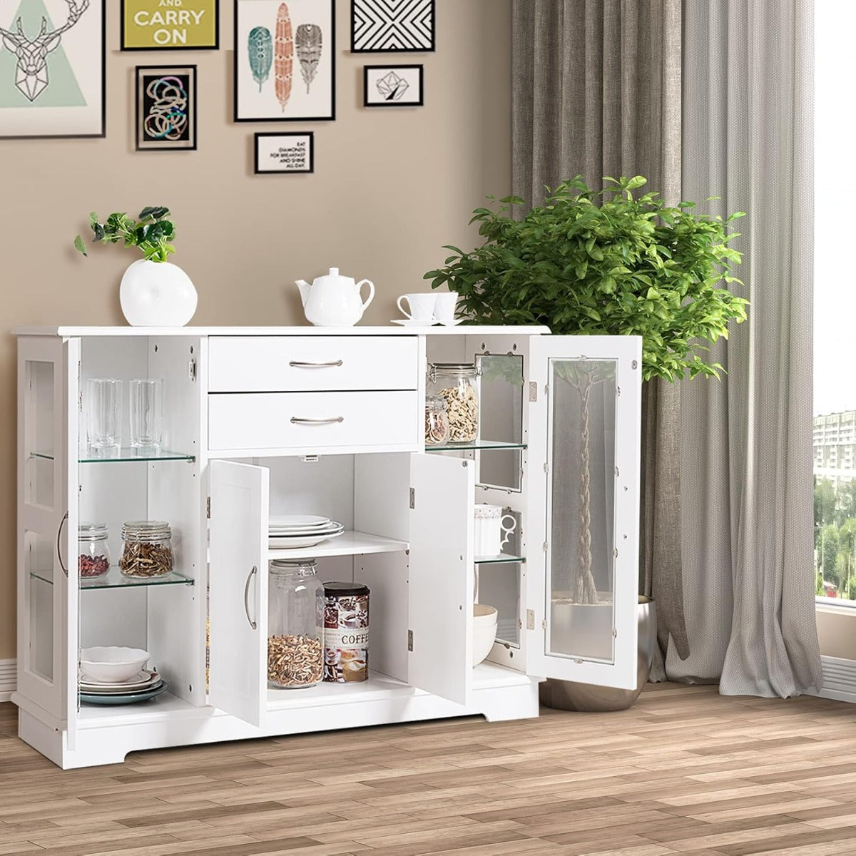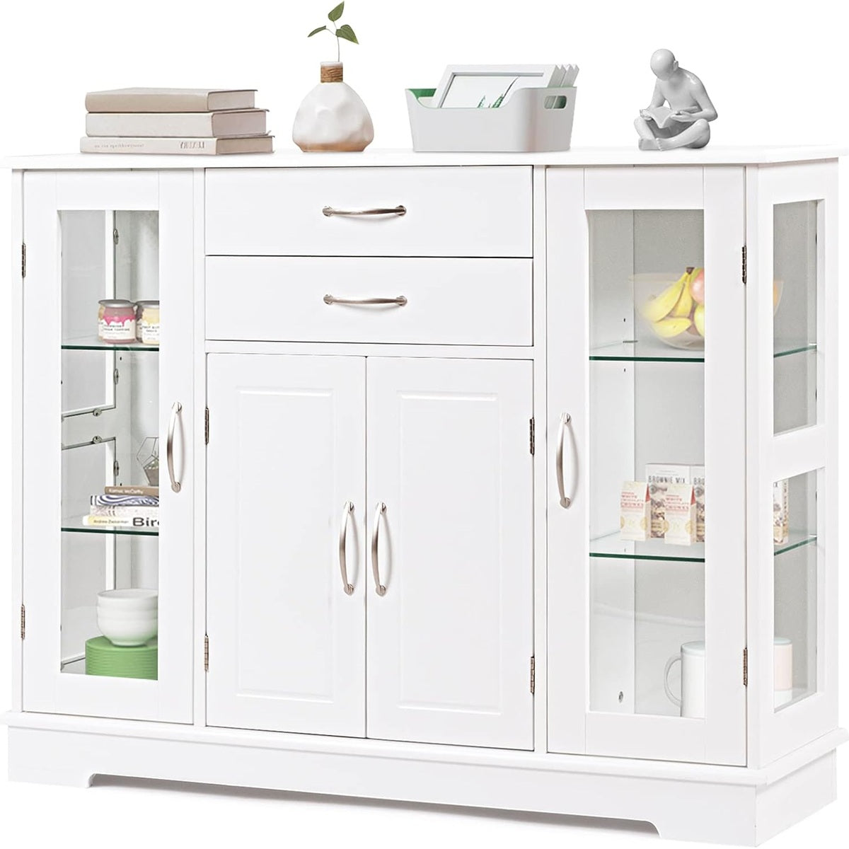 Aparador Elegante de Madeira com Portas de Vidro e 2 Gavetas Armário de Armazenamento para Sala de Jantar Corredor Branco