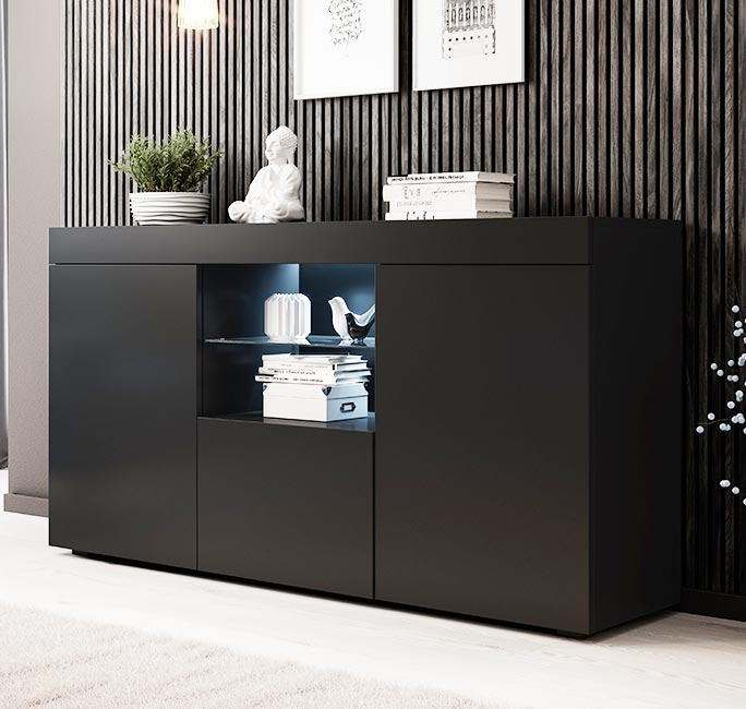 Aparador de linhas simples e retas com grande capacidade. Funcional e estético, ideal para espaços que pretendam potenciar a sensação de amplitude e luminosidade. Com luz LED e acabamento mate, este móvel dará ao teu espaço um toque de design atual.