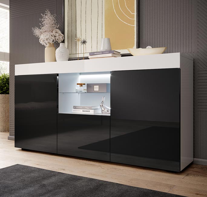 Aparador de linha moderna e elegante com luz LED. Possui 3 portas, uma delas abatível, e dois estantes separados por um vidro para guardar objetos volumosos. Estrutura em melamina brilhante, abertura push-click, estante de vidro e luz LED azul.