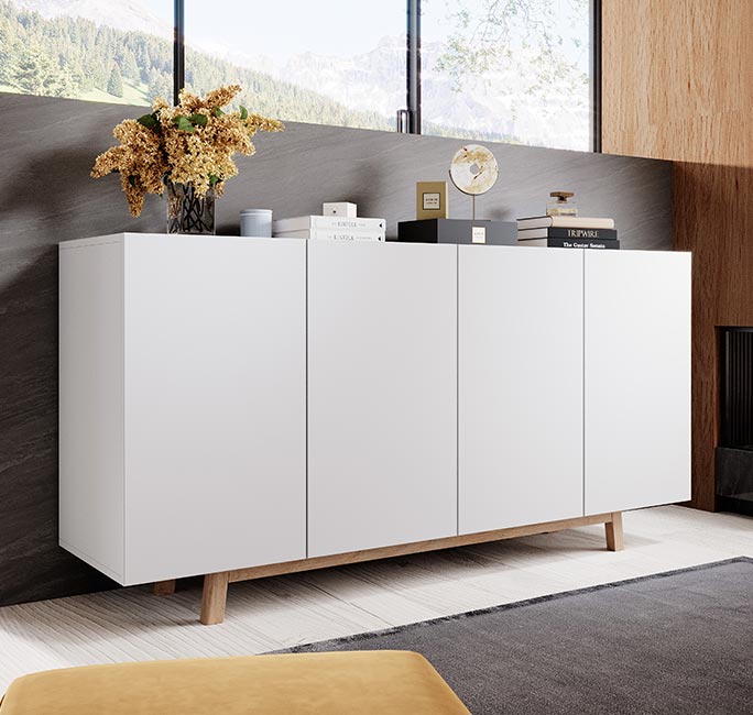 Um bonito e elegante aparador branco, com um toque diferenciador nas pernas, ideal para elevar a decoração da sala, da sala de jantar ou da entrada de casa.