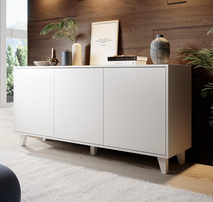 Aparador de design nórdico com muito estilo. Apresenta linhas definidas típicas dos móveis escandinavos, acolhedores e em tons claros, com pernas inclinadas. Ideal para dar vida à sala, com grande capacidade de arrumação. Fabricado na Europa.