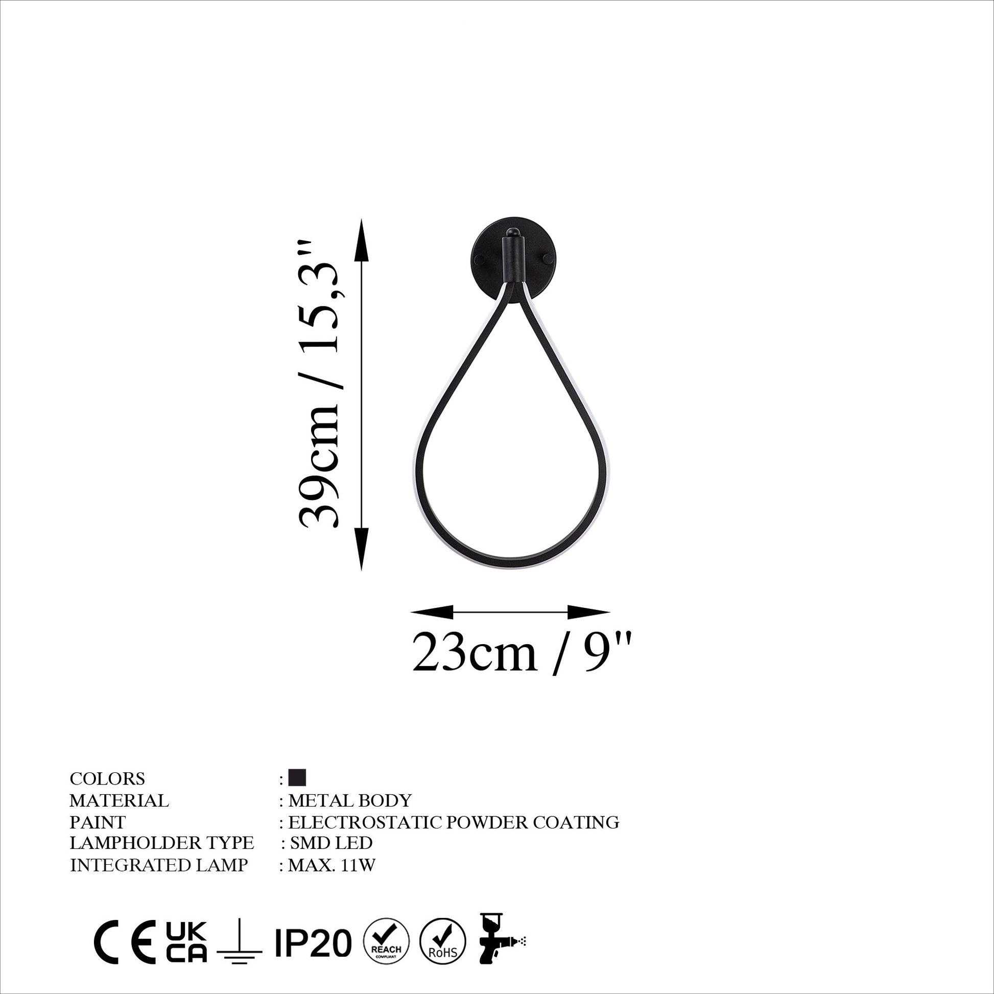 Candeeiro de Parede preta elegante, corpo de metal, 23 x 39 x 13 cm | LED SMD 11 W 3000 K | Classificação IP20, perfeita para decoração moderna e iluminação ambiente