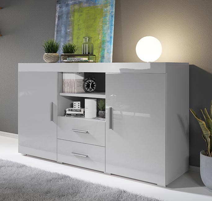 Aparador de linha moderna ideal para uma sala de estar moderna. Este aparador de 2 portas e 2 gavetas será muito útil para guardar todos os seus objetos volumosos e recuperar espaço na sua sala de jantar.