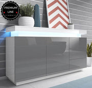 Aparador de linha moderna, ideal para um salão elegante e moderno. Com 2 portas, 2 compartimentos em cada uma e 3 espaçosos gavetões para organizar os teus objetos. Material de alta qualidade, luzes LED com controlo remoto e várias cores.