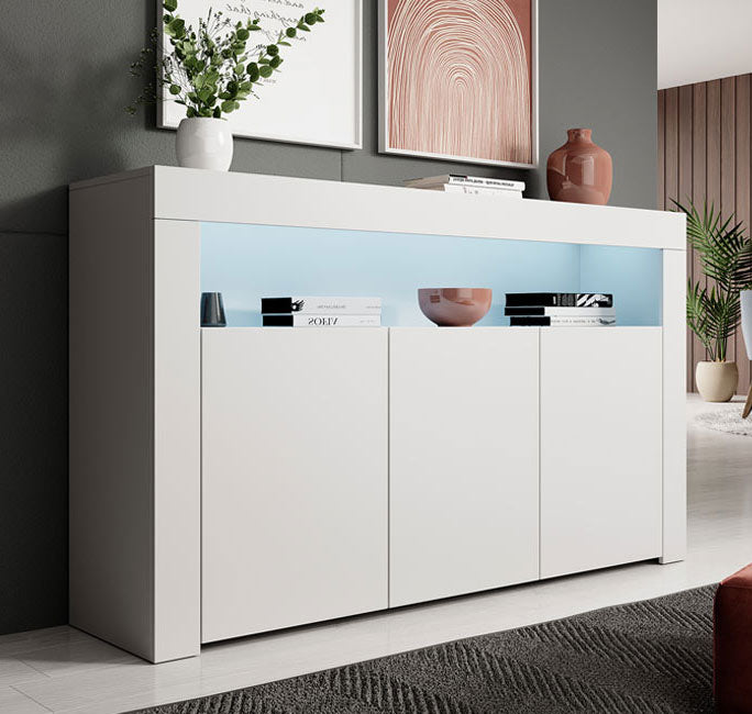 Fabuloso aparador de linha moderna, muito elegante e com luz LED. Com três portas e uma zona iluminada, é perfeito para guardar objetos volumosos e poupar espaço no teu comedor.