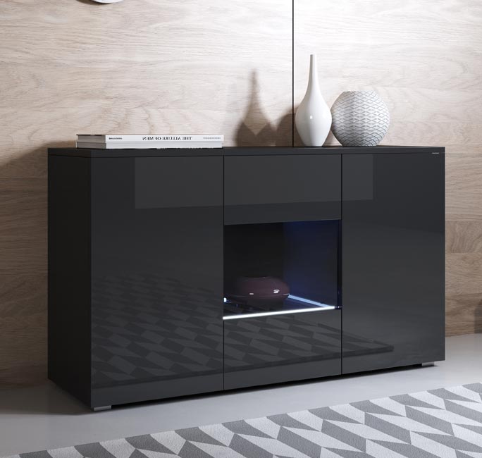 Aparador de design elegante e moderno, com acabamento brilhante. Oferece amplo espaço interno para organização e superfície para objetos decorativos.