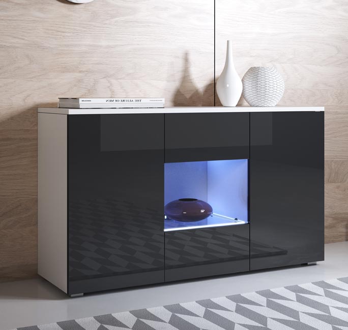Aparador de design elegante e moderno, com acabamento brilhante que se adapta à tua casa. Espaçoso interior para organizares utensílios e decorares.
