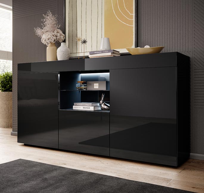 Aparador de linha moderna e elegante com luz LED. Possui 2 portas, 1 amplo gavetão e 2 prateleiras separadas por vidro, ideal para organizar objetos volumosos no teu espaço de refeições.