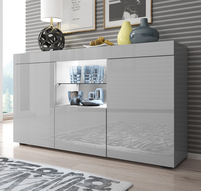 Aparador de linha moderna e elegante com luz LED. Possui 2 portas, um amplo cajão e dois estantes separados por cristal, ideal para organizar objetos volumosos no seu espaço. Materiais de alta qualidade e montagem fácil.