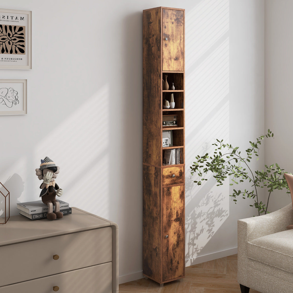 Este armário alto de arrumação será a solução perfeita para quartos pequenos! Com uma pegada pequena mas uma grande capacidade de armazenamento, este armário alto inclui 2 armários, 5 compartimentos e 1 gaveta, sendo ideal para quartos pequenos ou cantos da sua casa, criando espaço de armazenamento adicional. Além disso, possui 5 prateleiras ajustáveis para personalizar o espaço de armazenamento de acordo com as suas necessidades. Feito de material de MDF de alta qualidade, este armário de casa de banho tem uma estrutura durável e resistente. Pode ser fixado à parede com o dispositivo anti-tombo incluído, tornando-o mais seguro para famílias com crianças e animais de estimação.