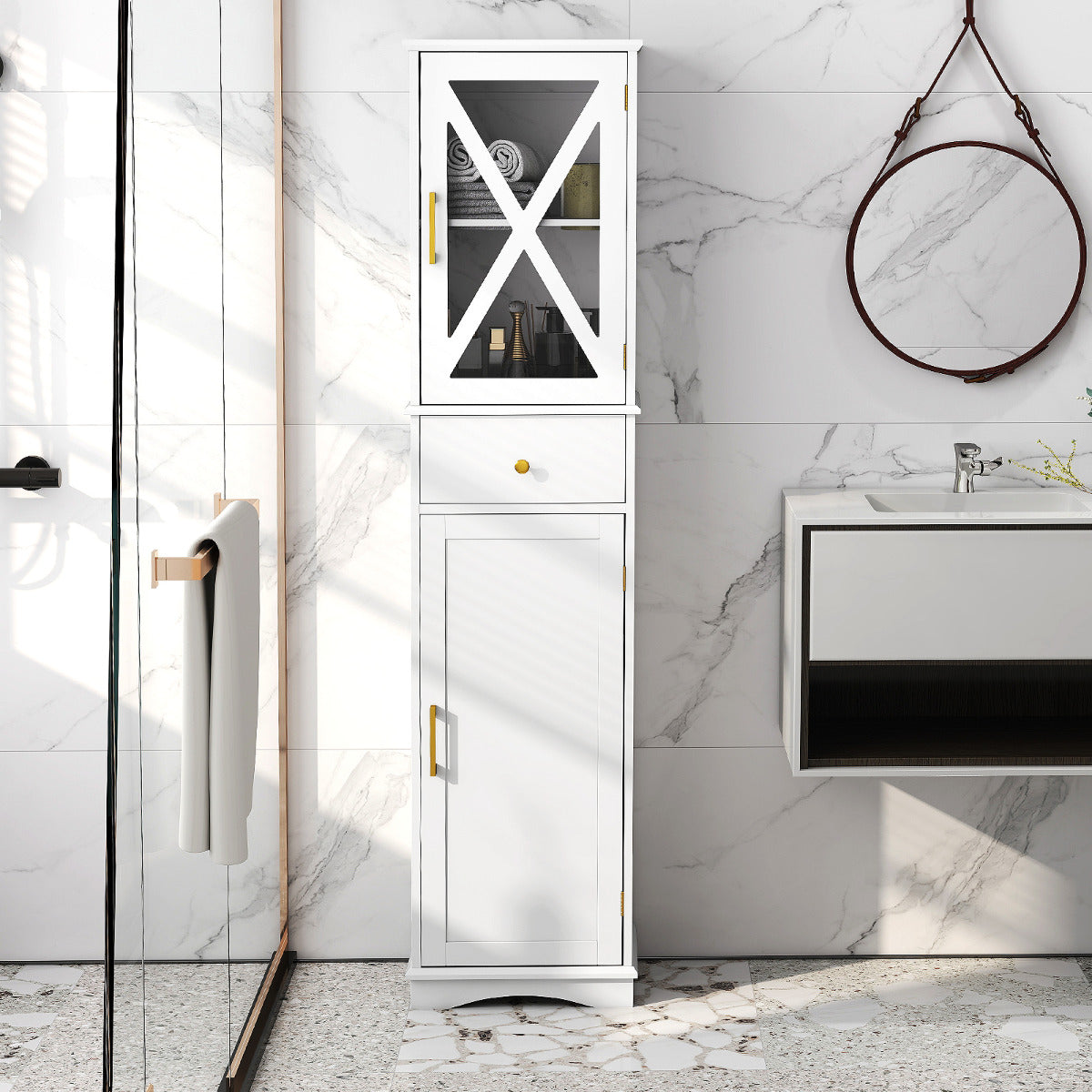 Armário Alto de Casa de Banho Gabinete Estreito de Arrumação com Gaveta 2 Portas e 3 Prateleiras Torre de Linho Independente para Cozinha Branco