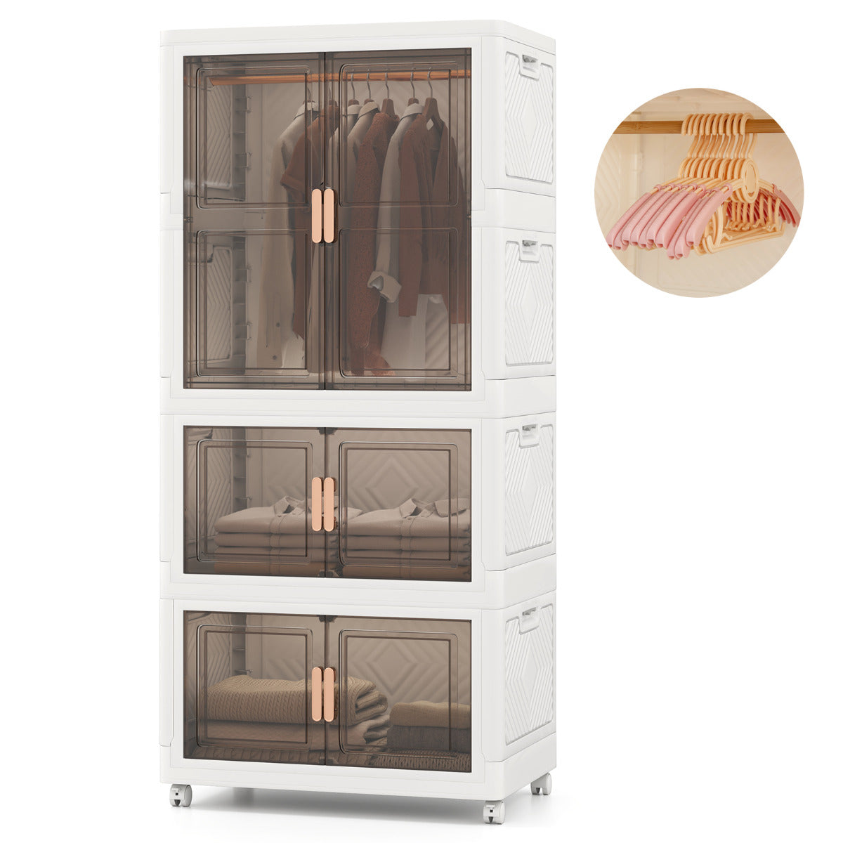 Características: Organizador de armazenamento prático com áreas para pendurar e empilhar; 10 cabides incluídos; contentores dobráveis com lado compacto para fácil armazenamento; 4 rodas universais, 2 delas bloqueáveis, para mobilidade de 360°; portas transparentes com elegantes puxadores e fechos magnéticos; superfície impermeável para fácil manutenção; adequado para quartos, salas de estar.