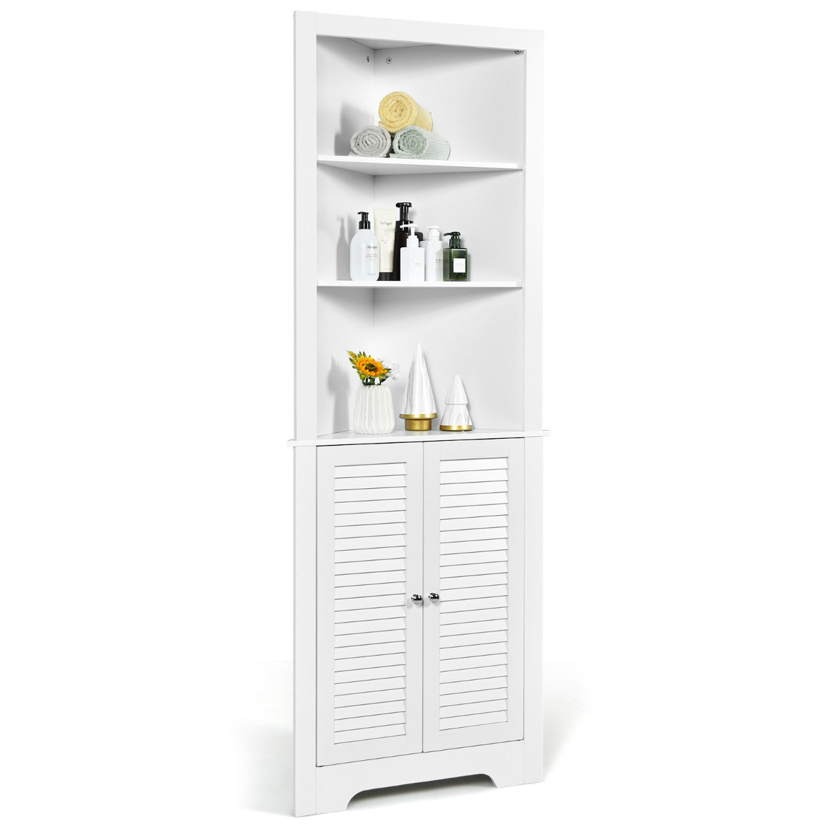 O nosso versátil armário de canto oferece amplo espaço de arrumação para diversos objetos. Fabricado em painel de fibras de densidade média de alta qualidade, este móvel para casa de banho é estável e durável. As três prateleiras abertas e o armário alto fechado proporcionam espaço suficiente para toalhas, gel de banho, livros e outros utensílios. O seu design elegante e moderno encaixa perfeitamente na sua casa de banho, quarto e sala de estar. Se valoriza a organização e a limpeza, vai adorar.