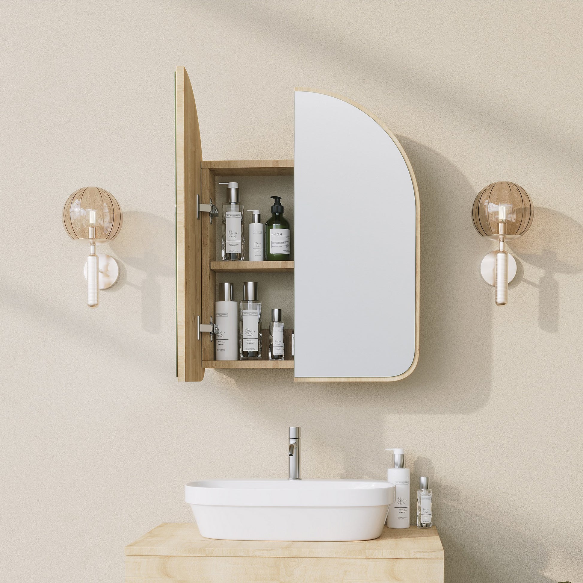 Armário de banheiro elegante bege com espelho, 100% fibra de madeira, 18 mm de espessura, 50 x 12 x 45 cm | Solução de armazenamento elegante para espaços modernos