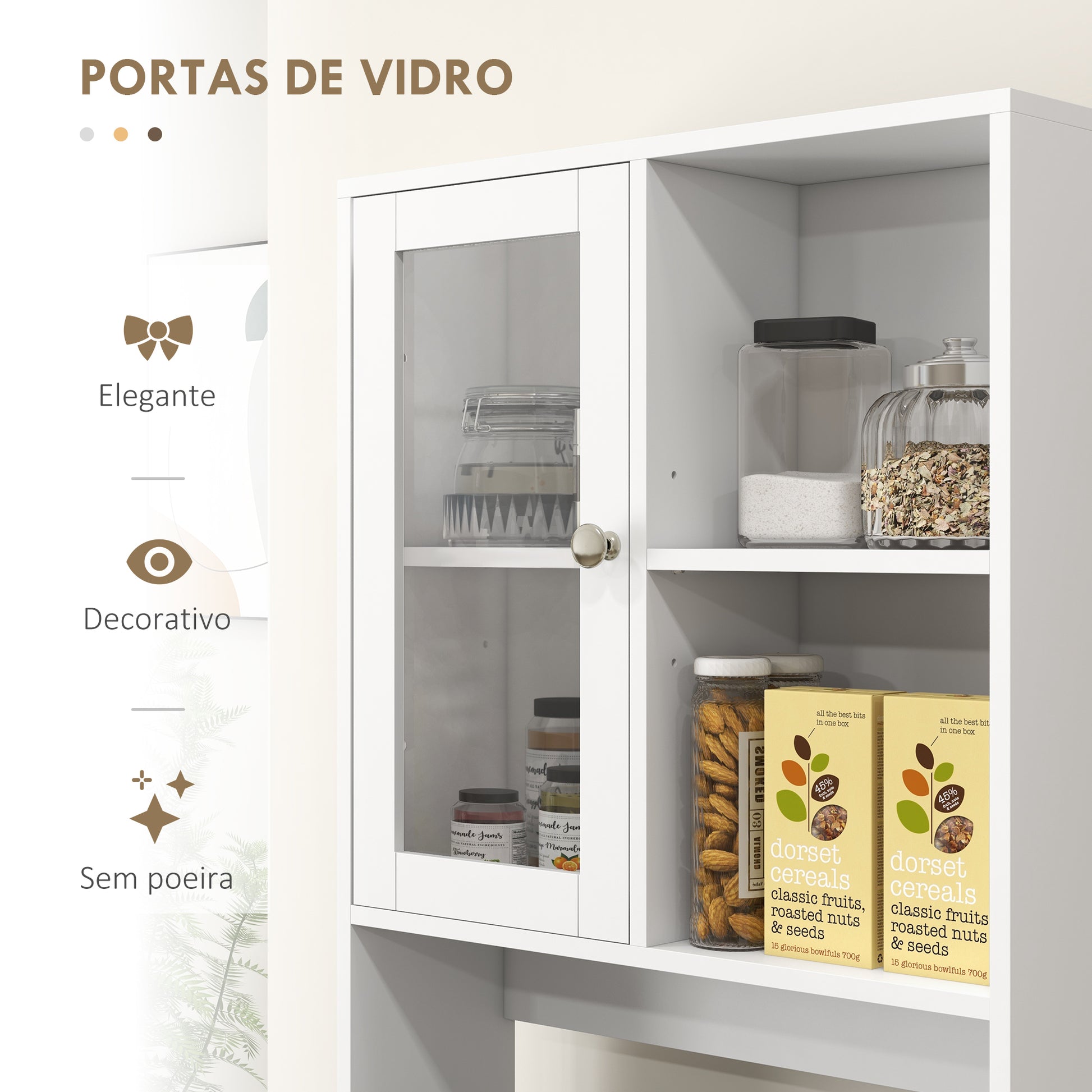- Benefícios: Prateleiras ajustáveis em altura para organizar de acordo com as suas necessidades. Portas de vidro temperado para mostrar o interior do armário.