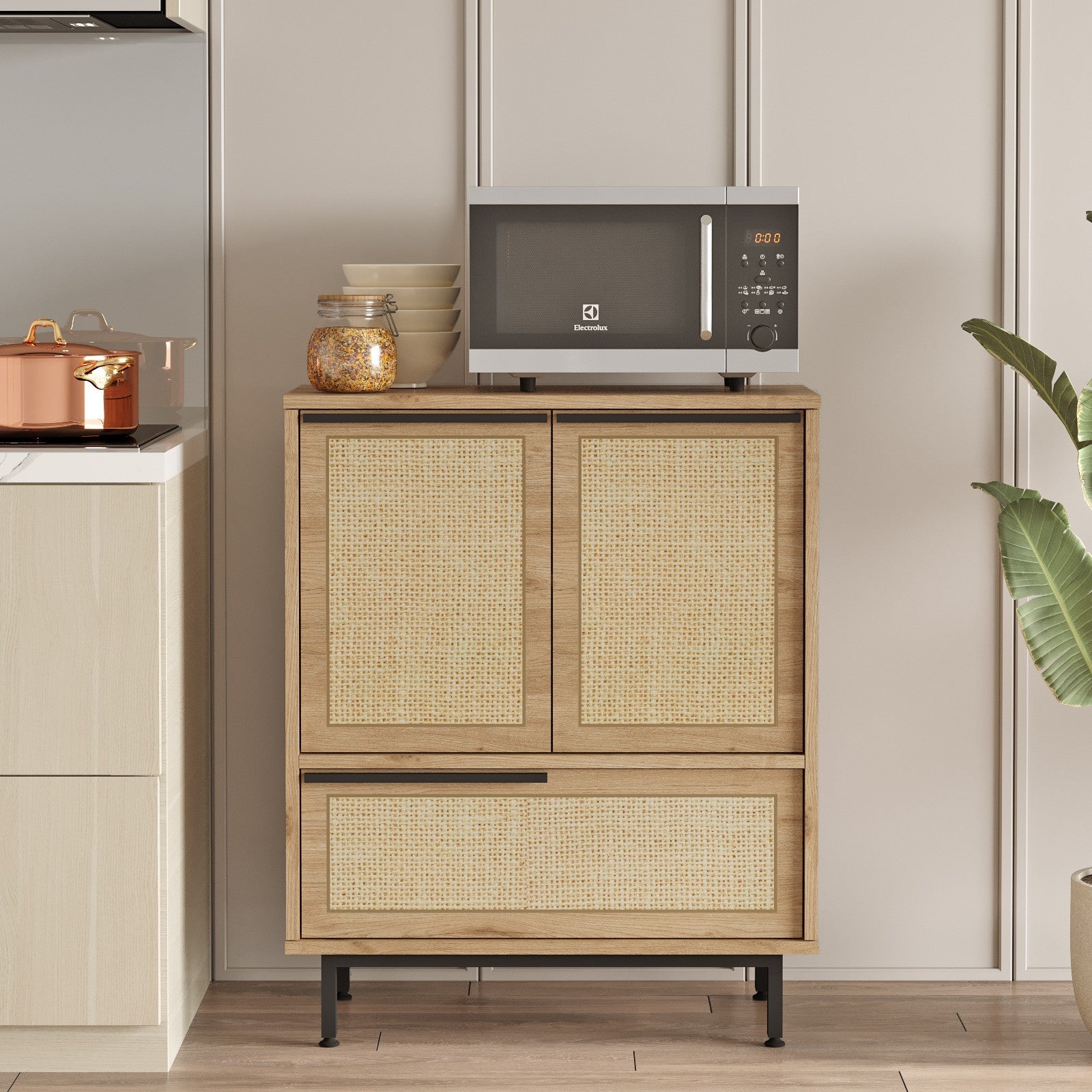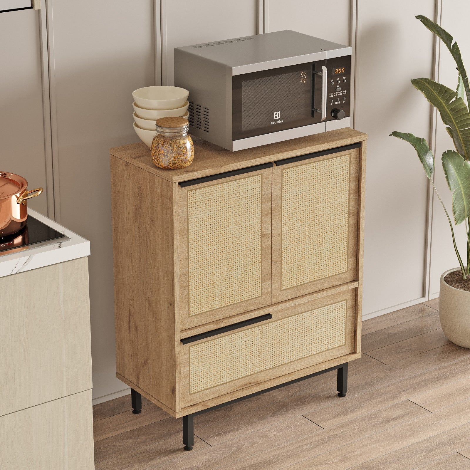 Com uma largura de 74,8 cm, uma altura de 90. 4 cm e uma profundidade de 35. 5 cm, o nosso armário de cozinha oferece um amplo espaço de arrumação para todos os seus utensílios de cozinha, pratos e utensílios. As pernas metálicas proporcionam um suporte robusto, enquanto o revestimento em melamina acrescenta um toque de elegância. Não é apenas um armário, é uma peça de afirmação!